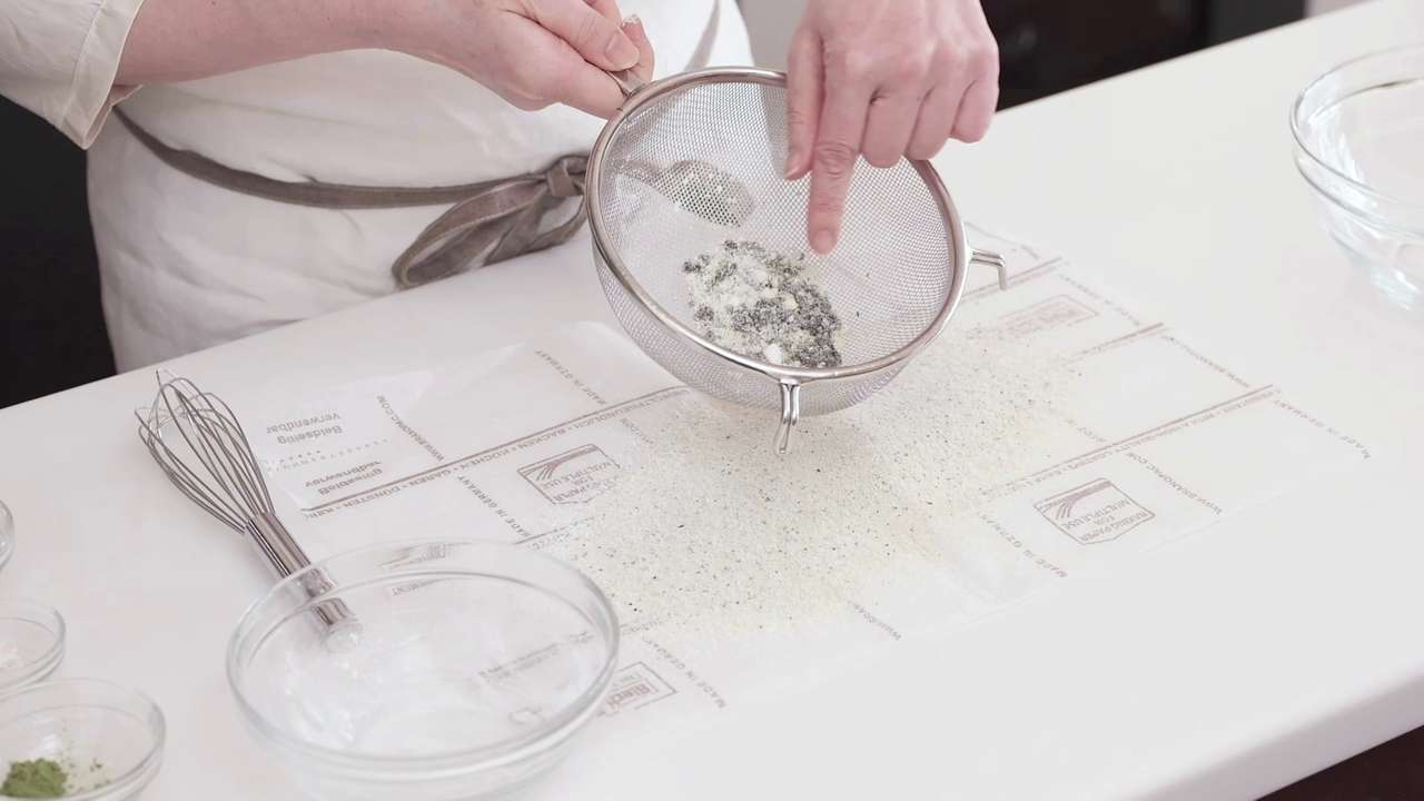 グラニュー糖、抹茶(あるいはヨモギパウダー)、薄力粉、アーモンドプードル、岩塩を合わせてボウルにいれて軽く混ぜ合わせる。混ぜ合わせたものをふるいにかける。網に残ったヨモギパウダーは手でゴシゴシとしごくような感じで網に通してふるいにかける。