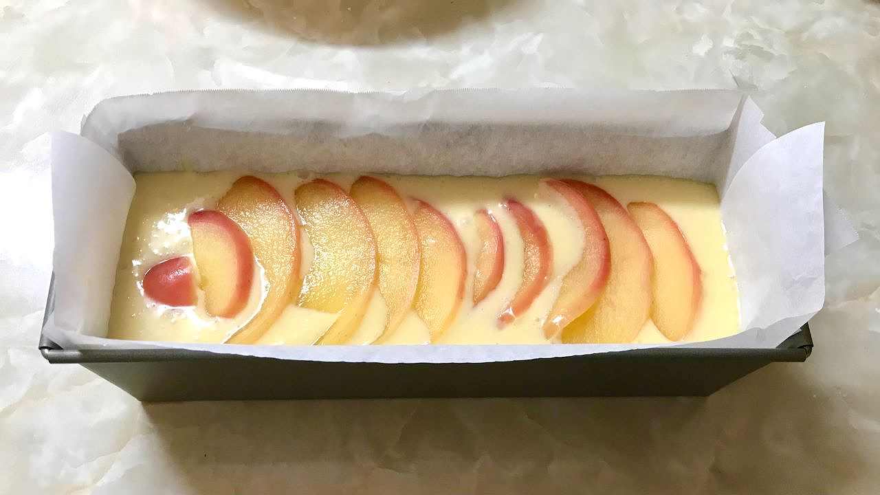 型に流し入れ、表面に1のスライスしたりんご煮を並べます。