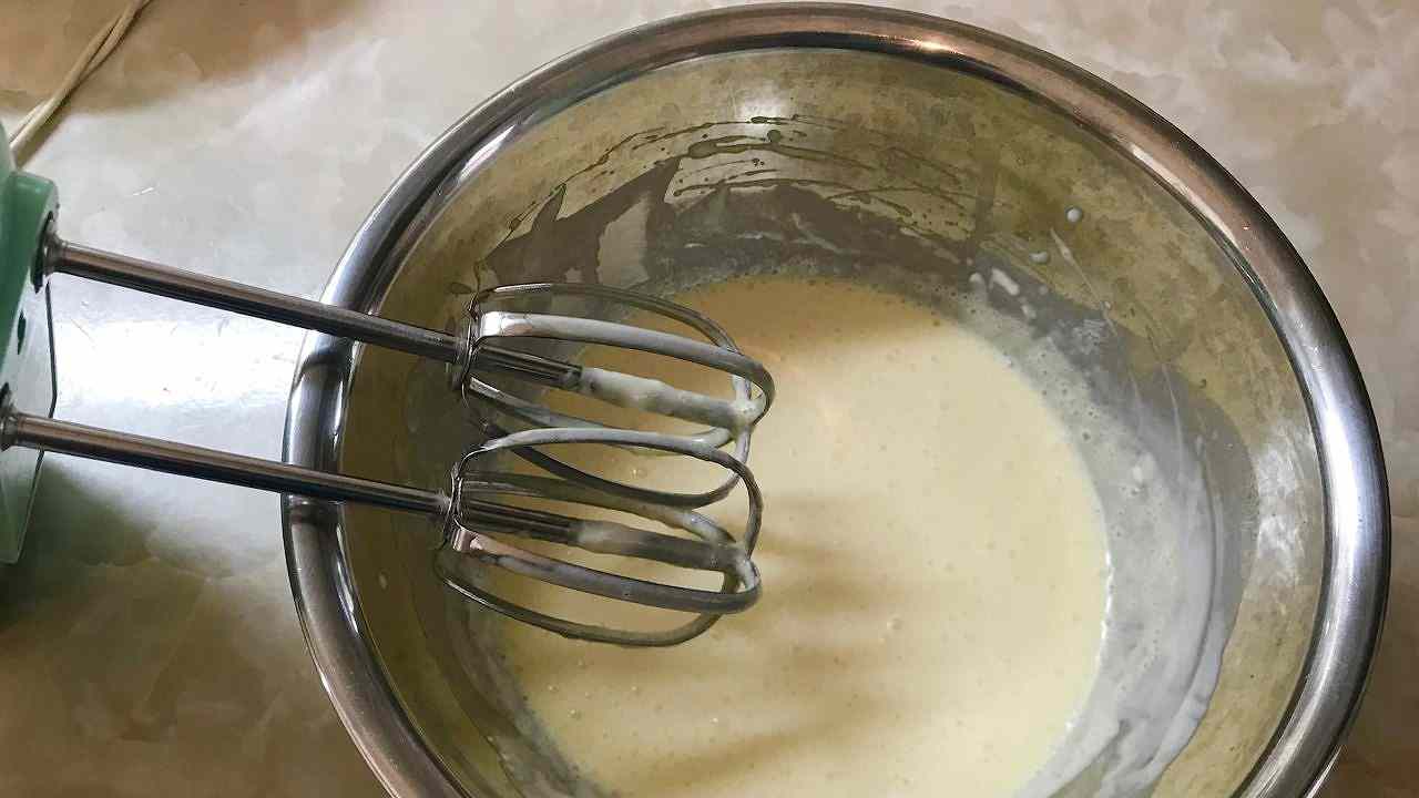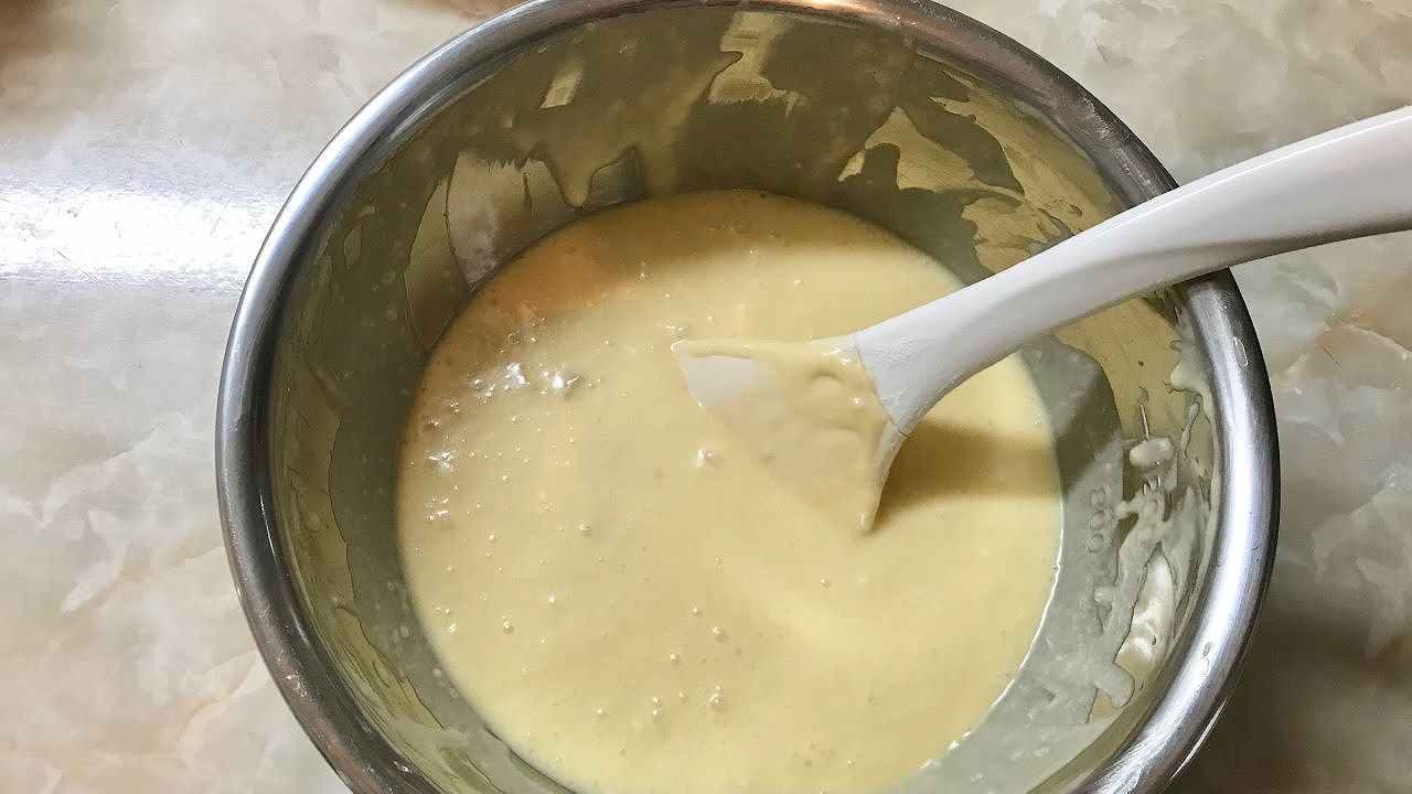 1へ溶き卵を数回に分けて入れ、しっかりと混ぜ合わせます。