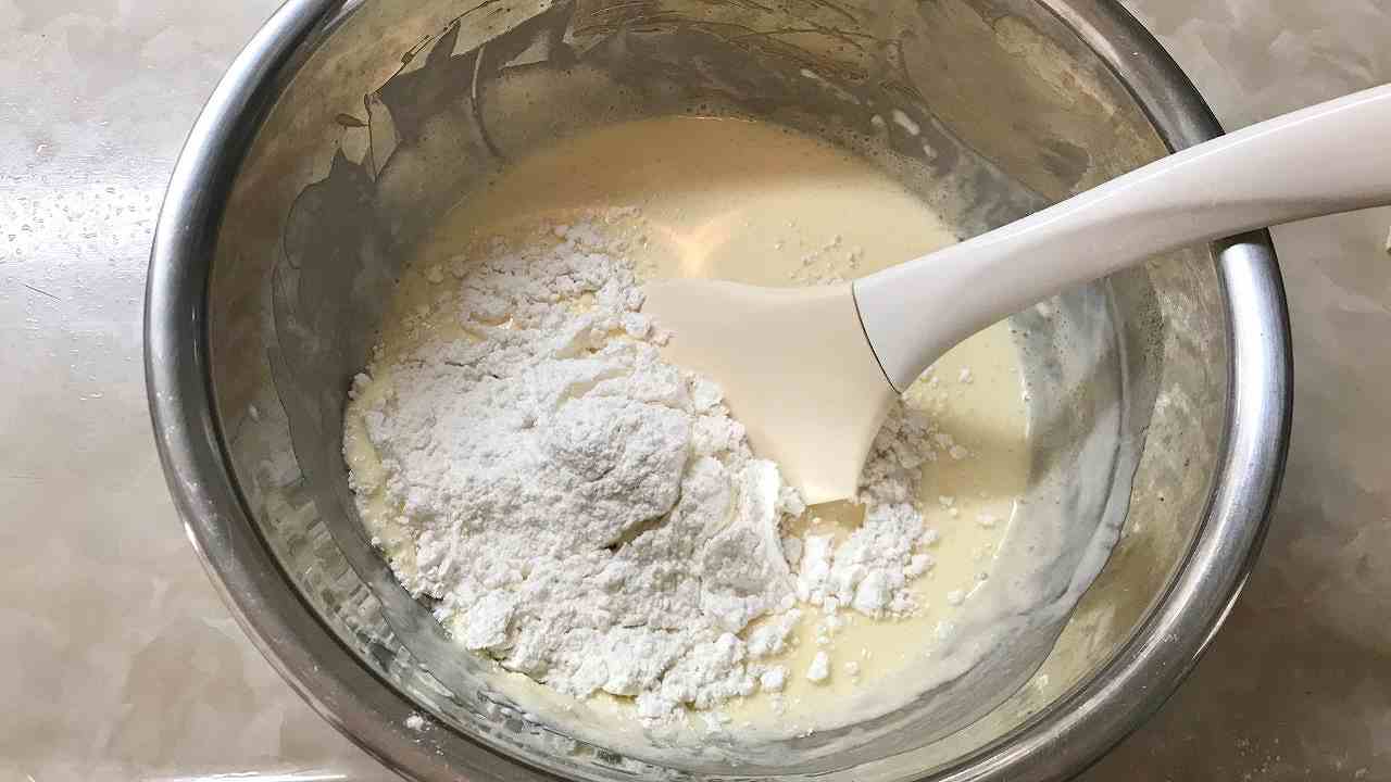 粉を入れてからの生地の混ぜ合わせは、とても重要な工程です。練ってしまうと粘りの原因となるグルテンが発生し、目の詰まった、もっちりかたい生地になってしまいます。