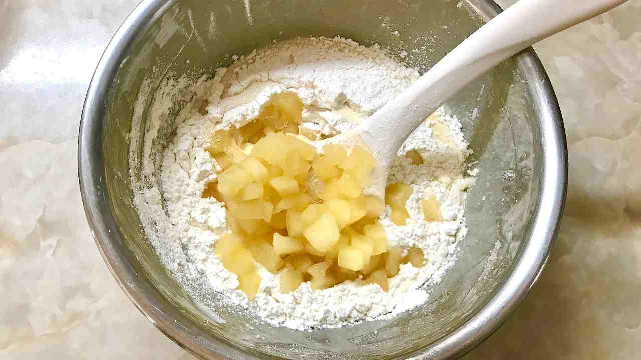 粉がある程度混ざったら、残りの粉を表面全体にふり入れ、その上に1の角切りりんご煮(汁も入れます)を散らすように加えます。この時、りんごに粉をまぶすようにしながら混ぜ合わせてください。こうすることでりんごが沈みにくくなります。