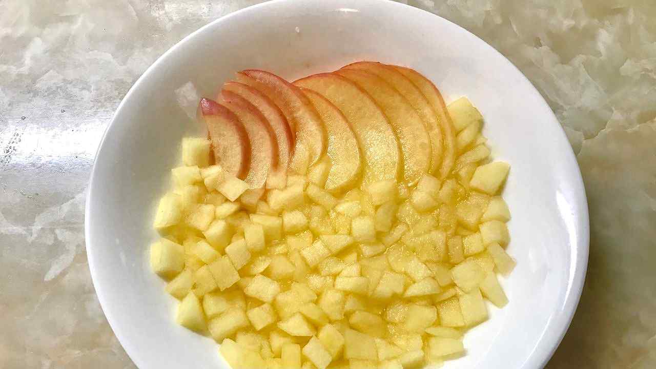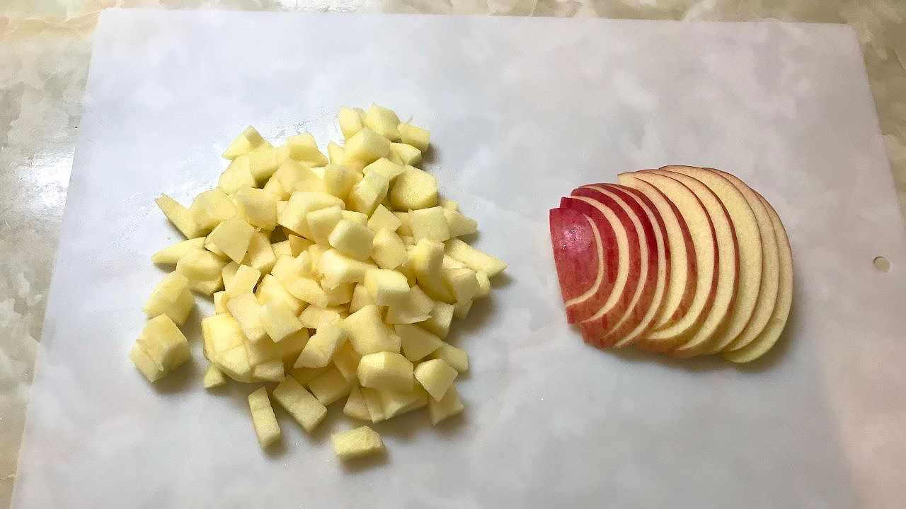 りんごは芯を取り除き、1/4個分は皮つきのまま5㎜幅にスライスします。残りは皮をむき5㎜~1cmの角切りにします。