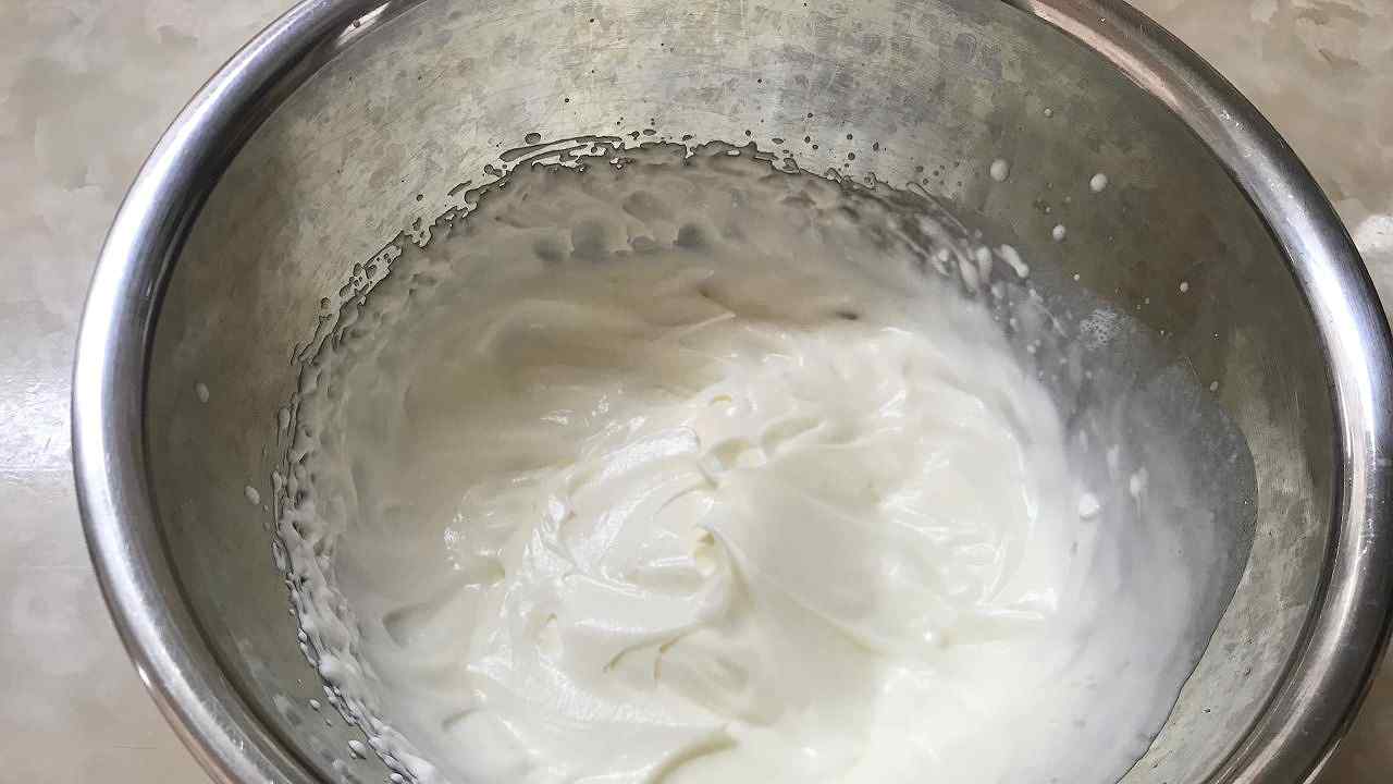 ボウルに生クリームと砂糖を入れ、ハンドミキサー(泡立て器)で8分立てに泡立てます。8分立ての目安は、泡立て器ですくうと柔らかなツノが立ち、その後おじぎするかたさです。