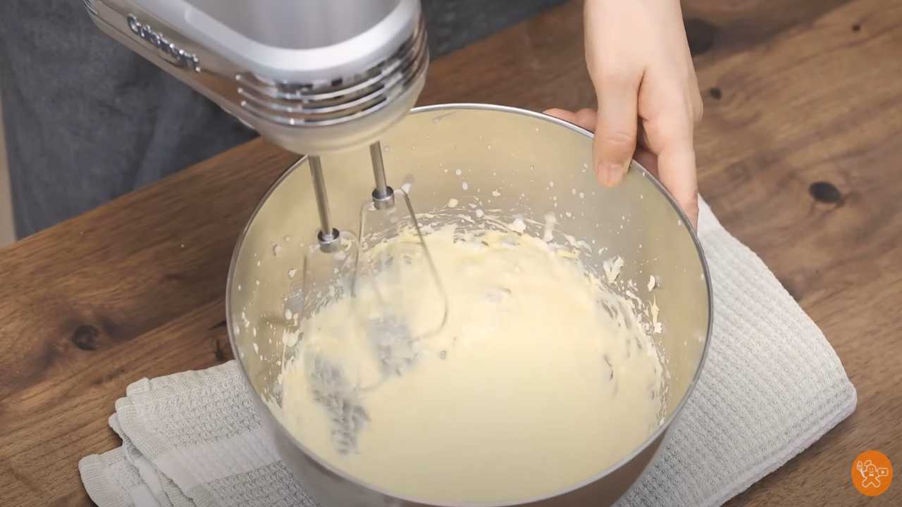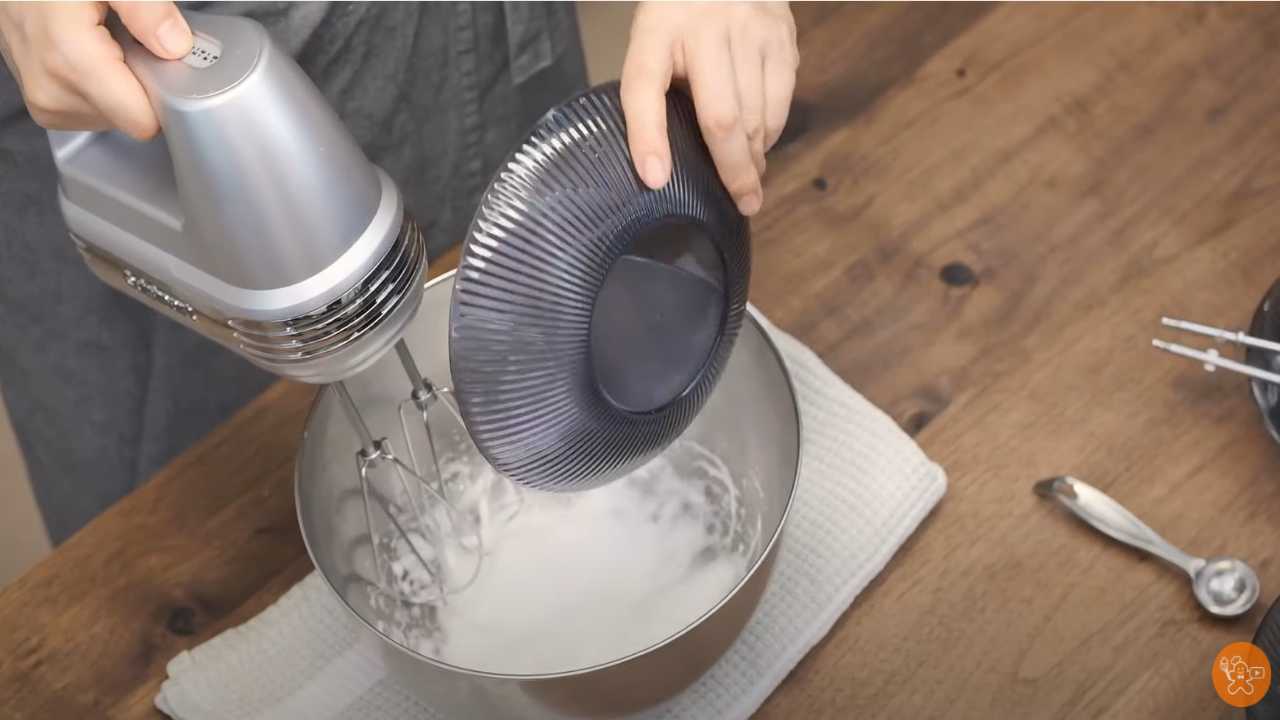 卵白をもったりするまで泡立てる。グラニュー糖を半分入れて泡立てる。残りのグラニュー糖を入れてメレンゲを作る。クリームチーズのボウルに加える。