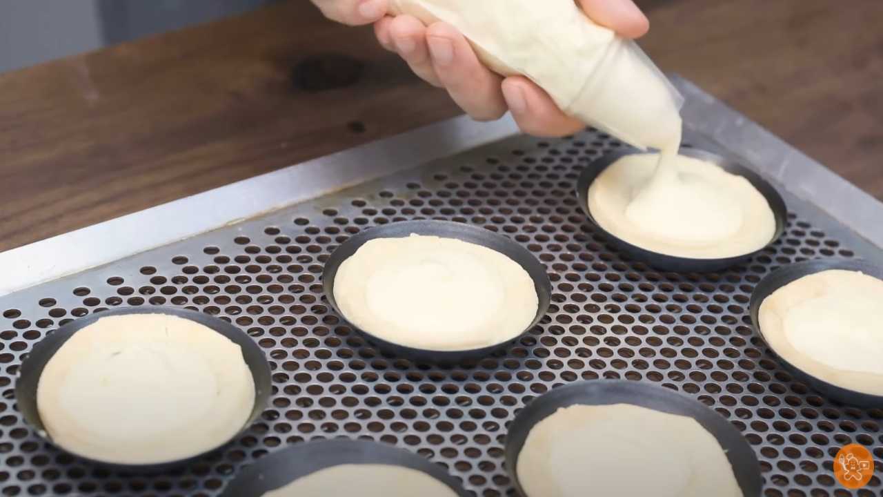 丸口金を付けた絞り袋にチーズクリームを入れる。粗熱を取ったタルト生地の上に流す。軽くたたいて平らにする。