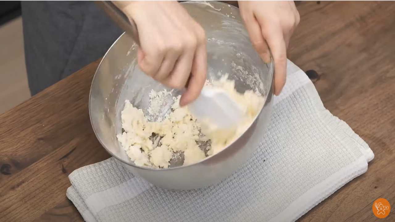 薄力粉をふるい入れ、ゴムベラで生地をまとめるようにして混ぜる。