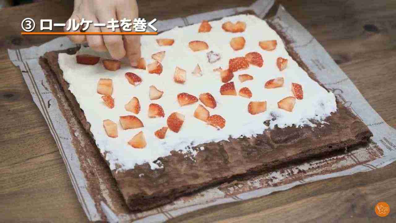 スライスしたいちご(5粒程度)を全体に並べて巻き上げる。- 6