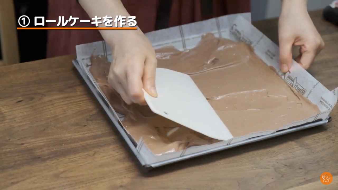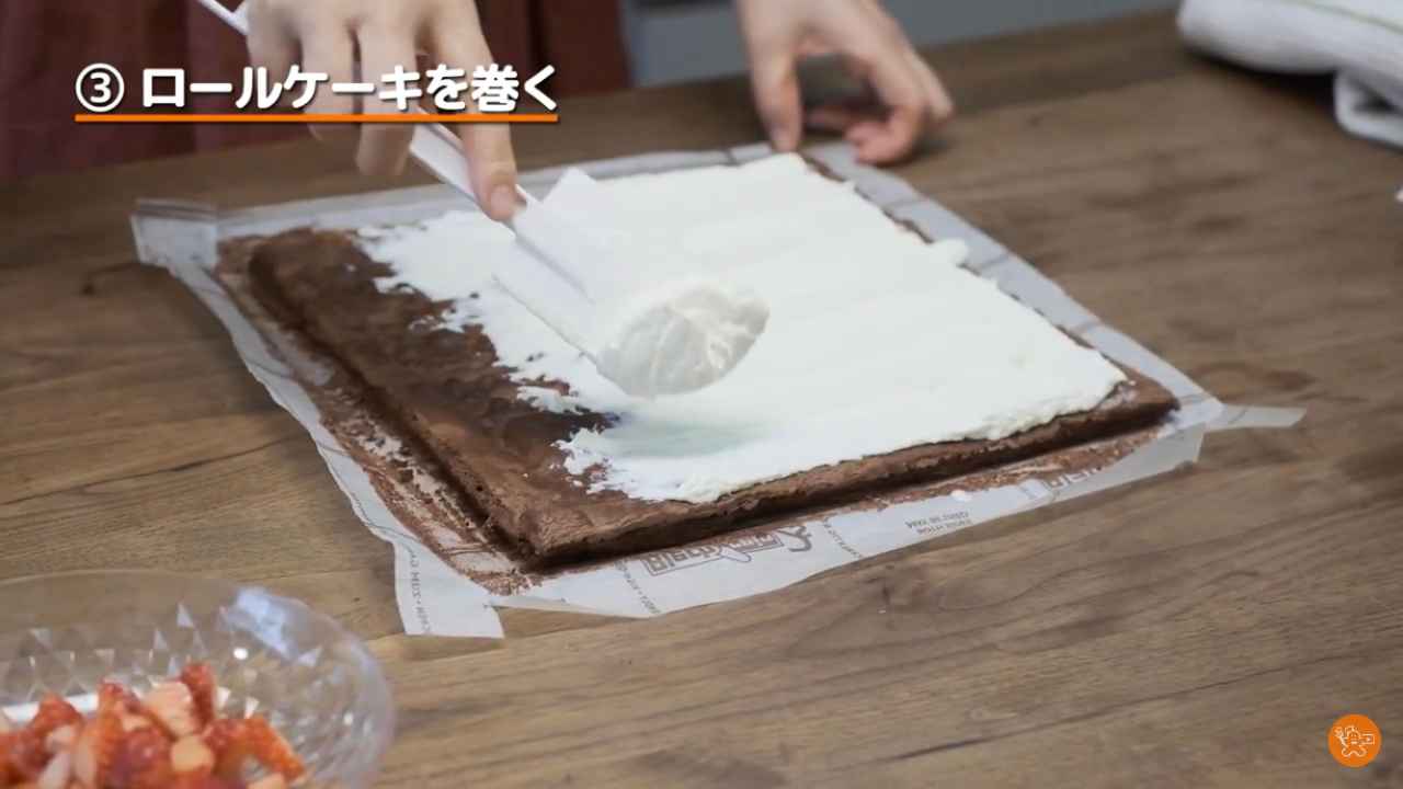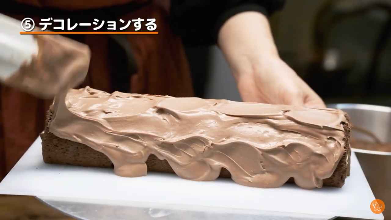 ロールケーキにゴムベラでチョコレートクリームを塗る。- 2