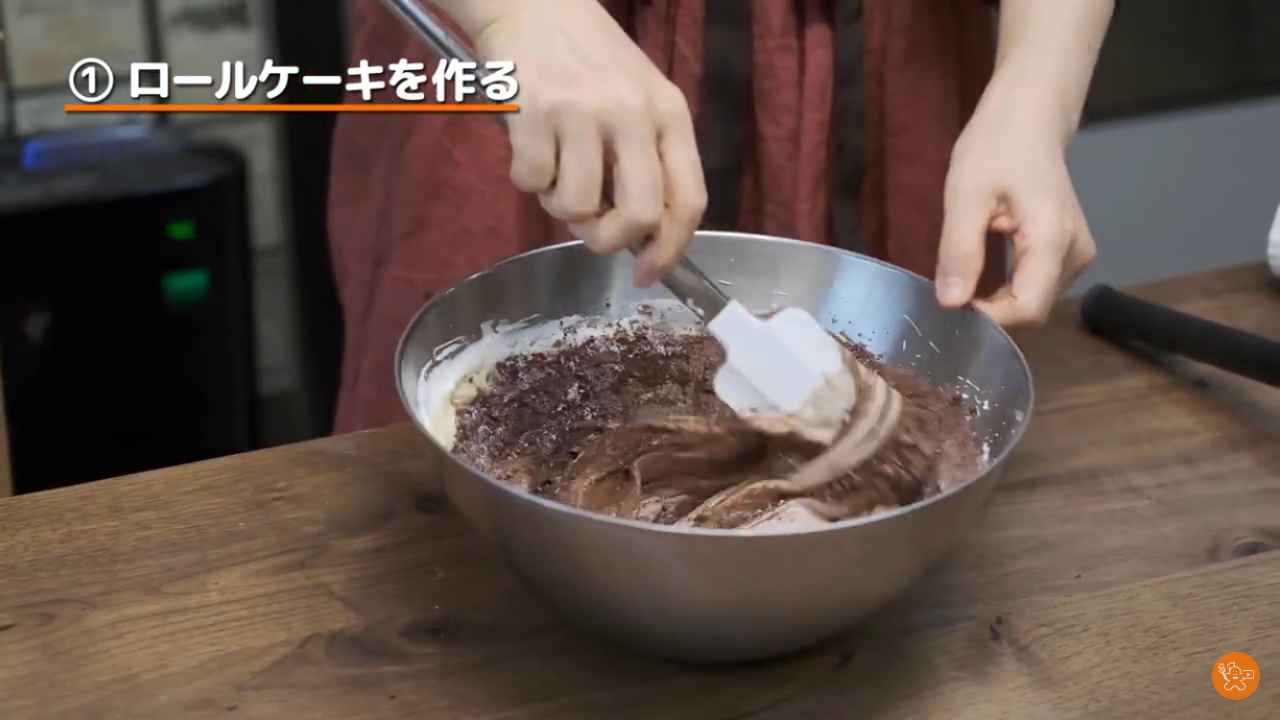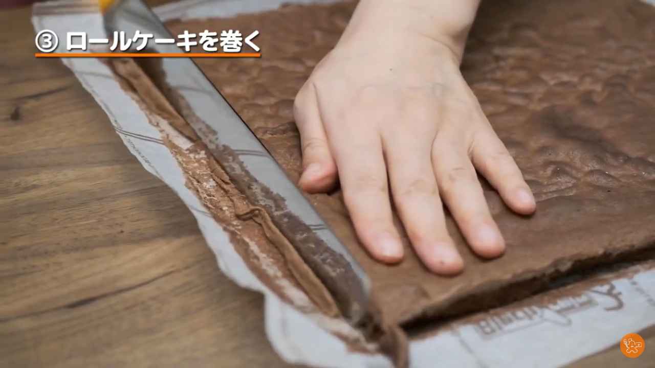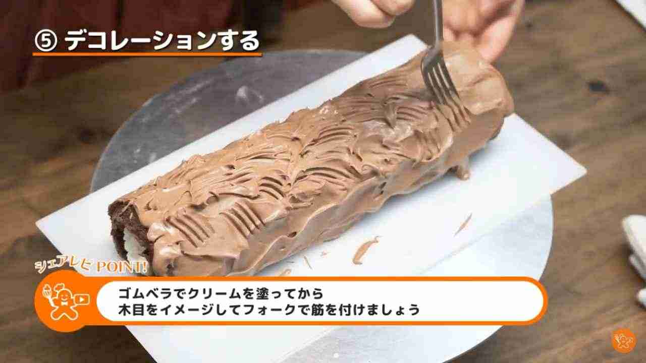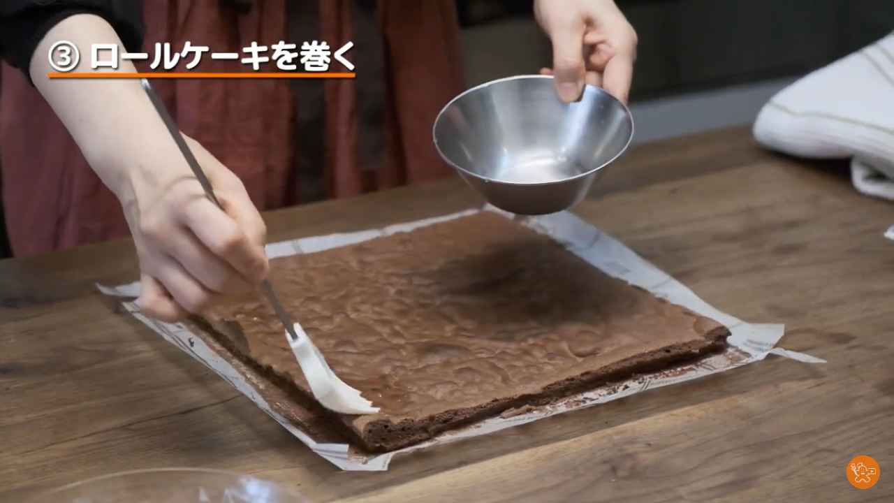 ロールケーキにゴムベラでチョコレートクリームを塗る。- 2