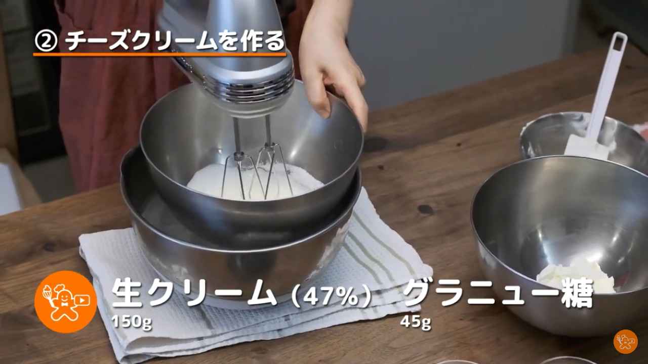 ボウルに生クリーム(150g)とグラニュー糖(45g)を入れて、6分立てにする。- 2