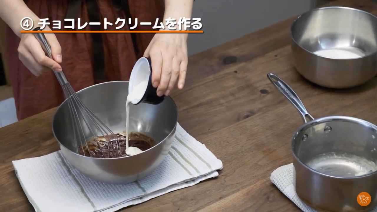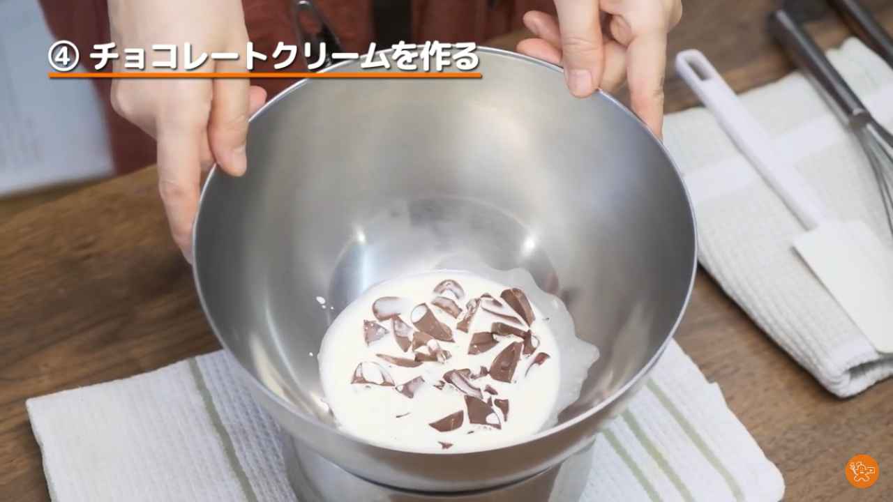 ボウルに刻んだチョコレート(60g)を入れて、生クリームを注ぐ。- 3