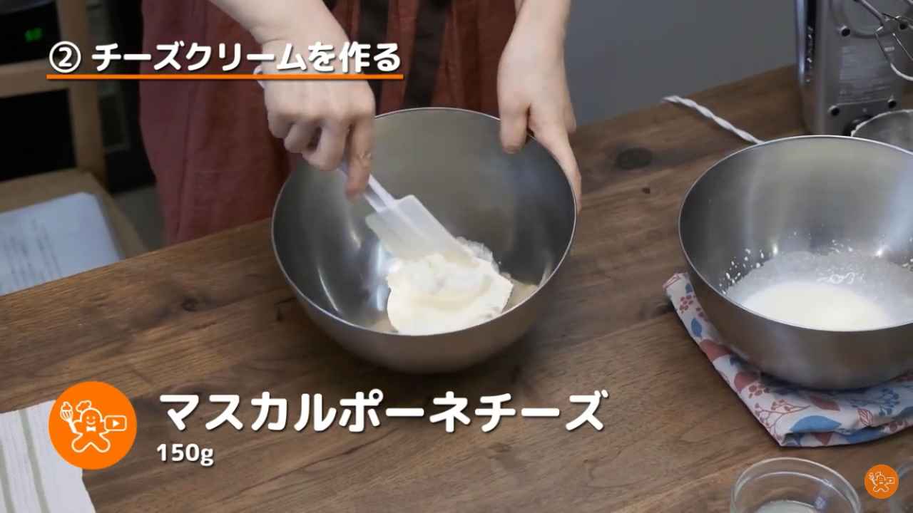 別のボウルにマスカルポーネチーズ(150g)を入れ、ゴムベラで優しく混ぜる。- 3