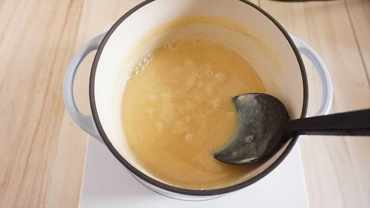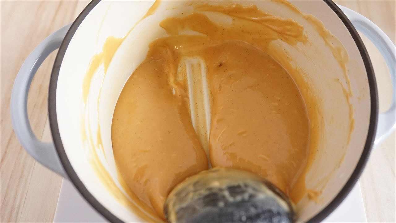 サラサラだった液体が煮詰まってくるにつれ、あのキャラメル独特のミルキーブラウンに変化します。