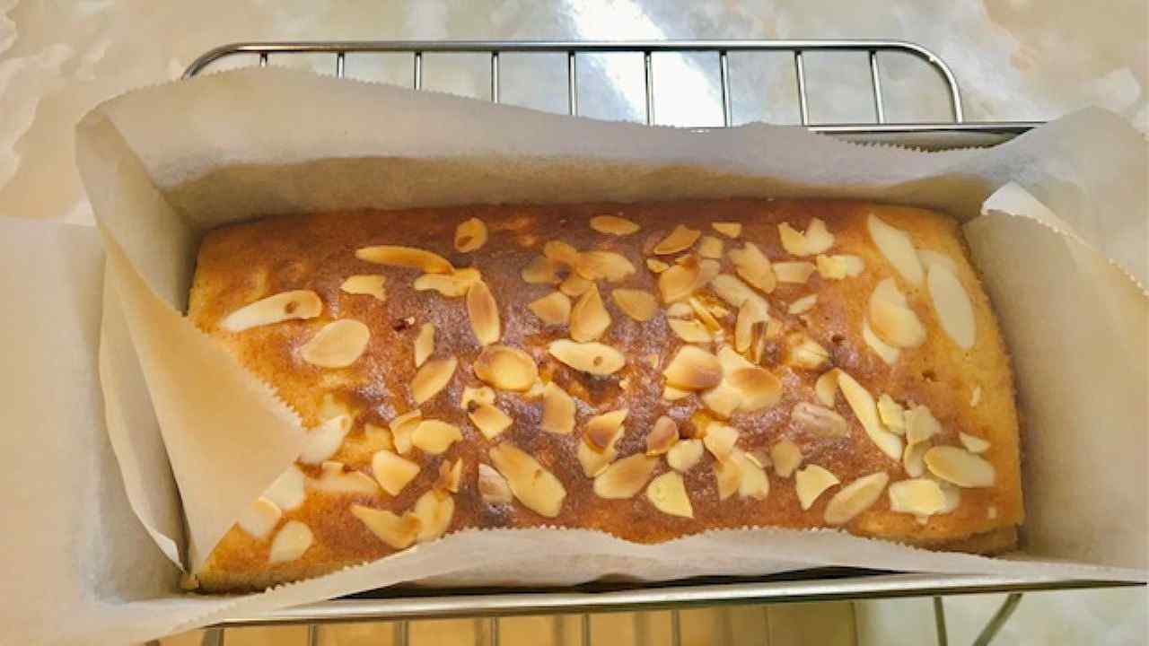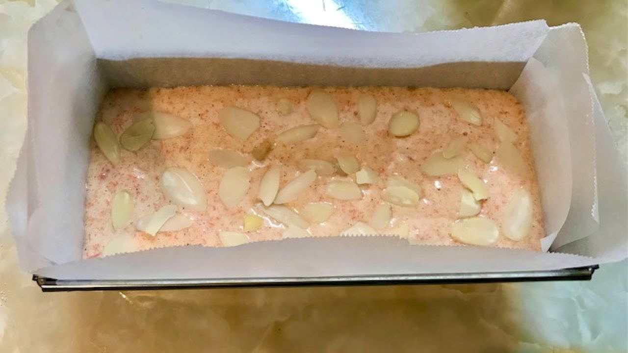 型に生地を流し入れ、布巾を敷いた台に底をトントンと打ちつけ空気を抜きます。お好みでアーモンドスライスを上にトッピングします。