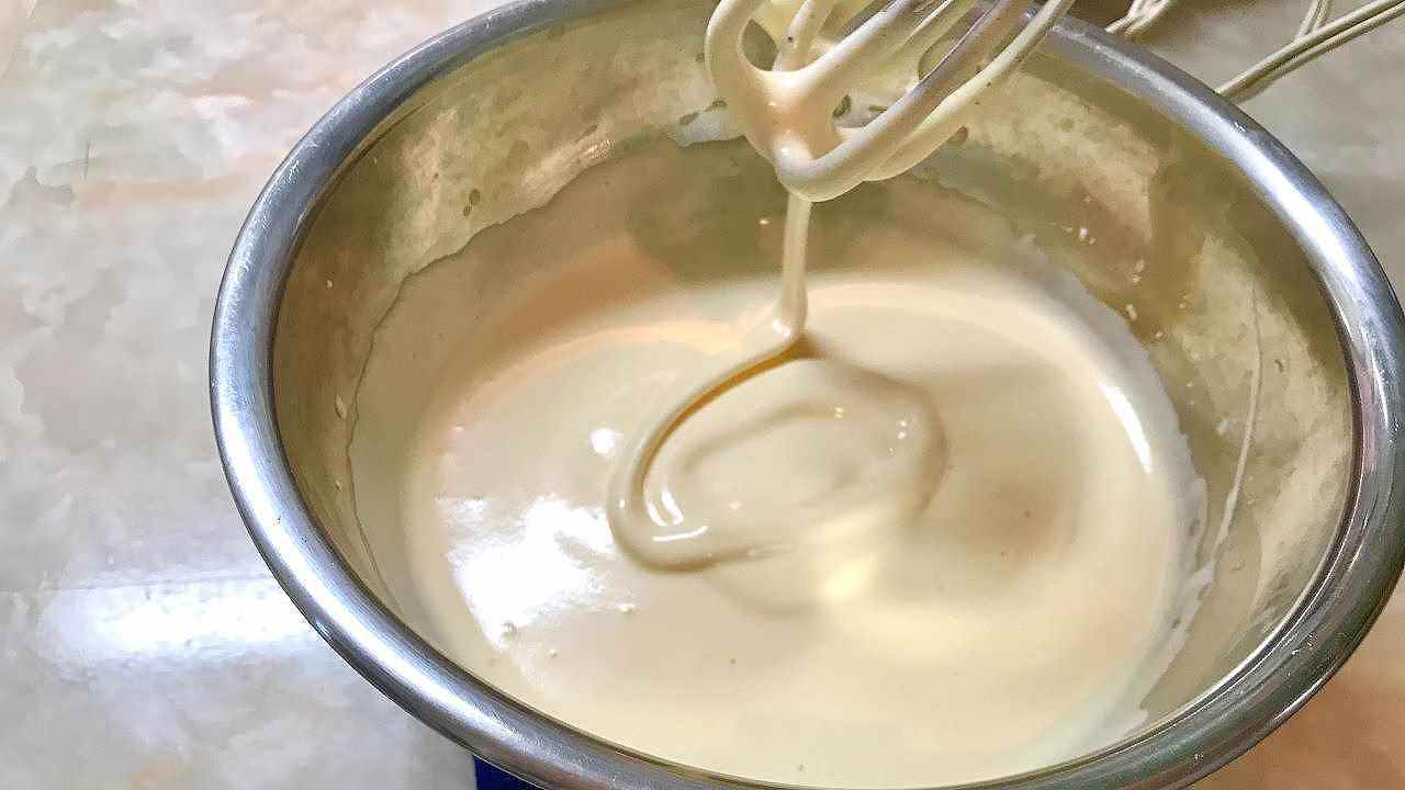 ボウルに卵と砂糖を入れ、ハンドミキサーで白くもったりとするまで泡立てます。目安は「の」の字が書けるくらいまで。