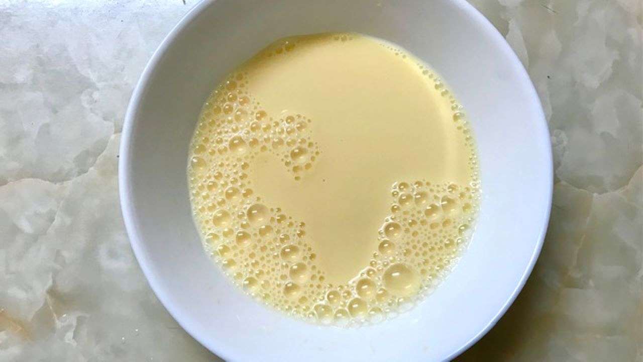 ボウルに卵を割り入れて溶きほぐし、牛乳を入れて混ぜます。