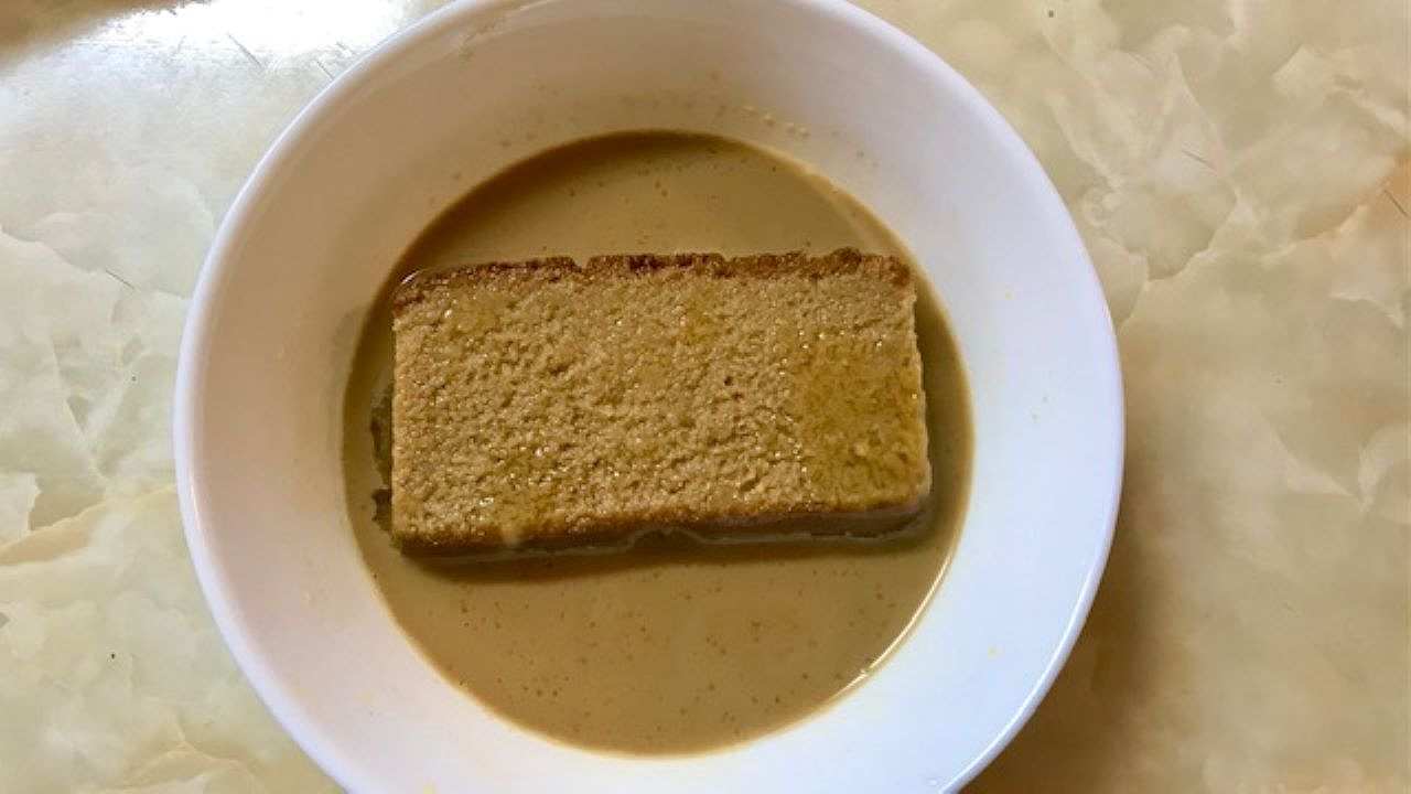 カステラを3のコーヒー液に浸します。あっという間にぐんぐん吸い込みます。30秒くらいで完全に染み込みます。※崩れやすいので浸し過ぎないよう注意してください。