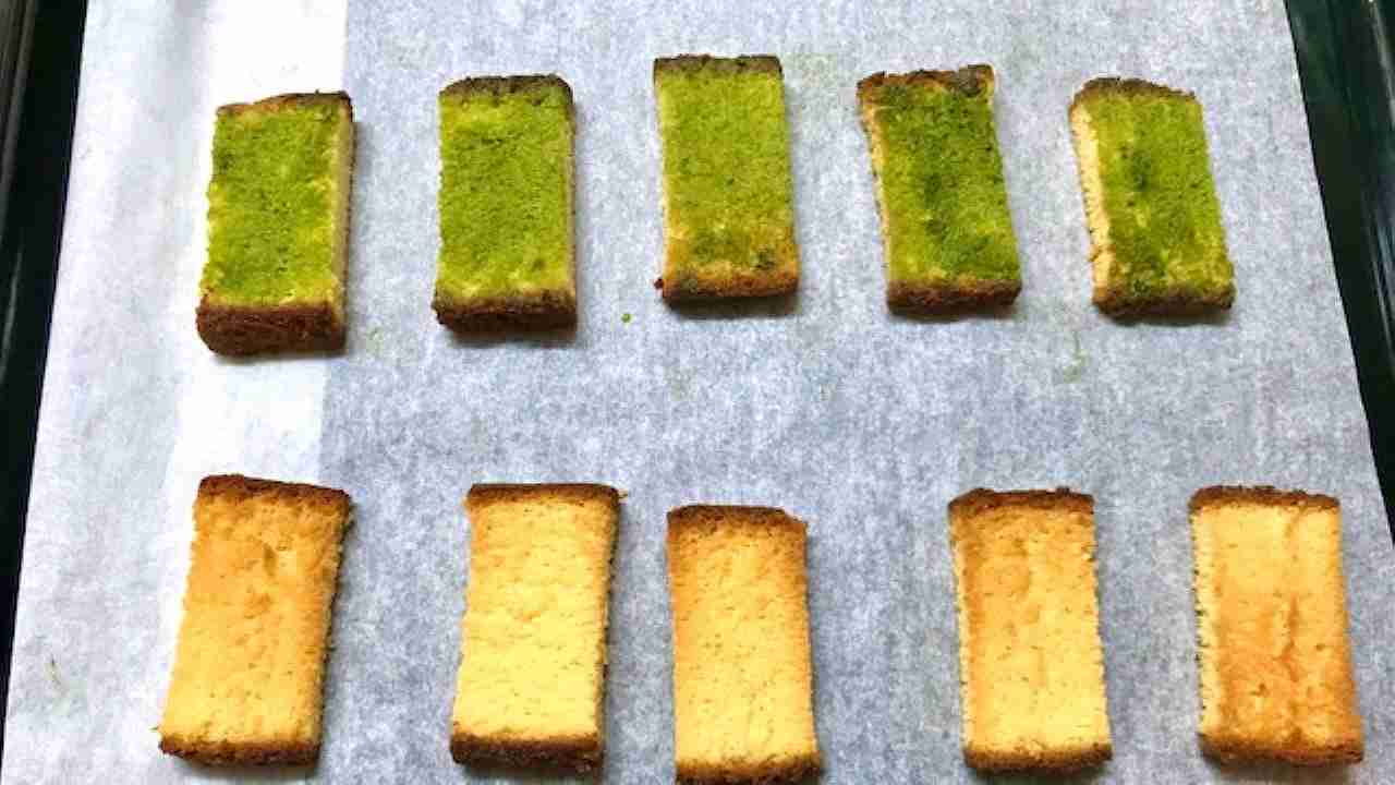 130℃のオーブンで15~20分きつね色になるまで焼いたら完成です。天板の上にそのまま放置し、粗熱がとれたらケーキクーラーの上で完全に冷まします。