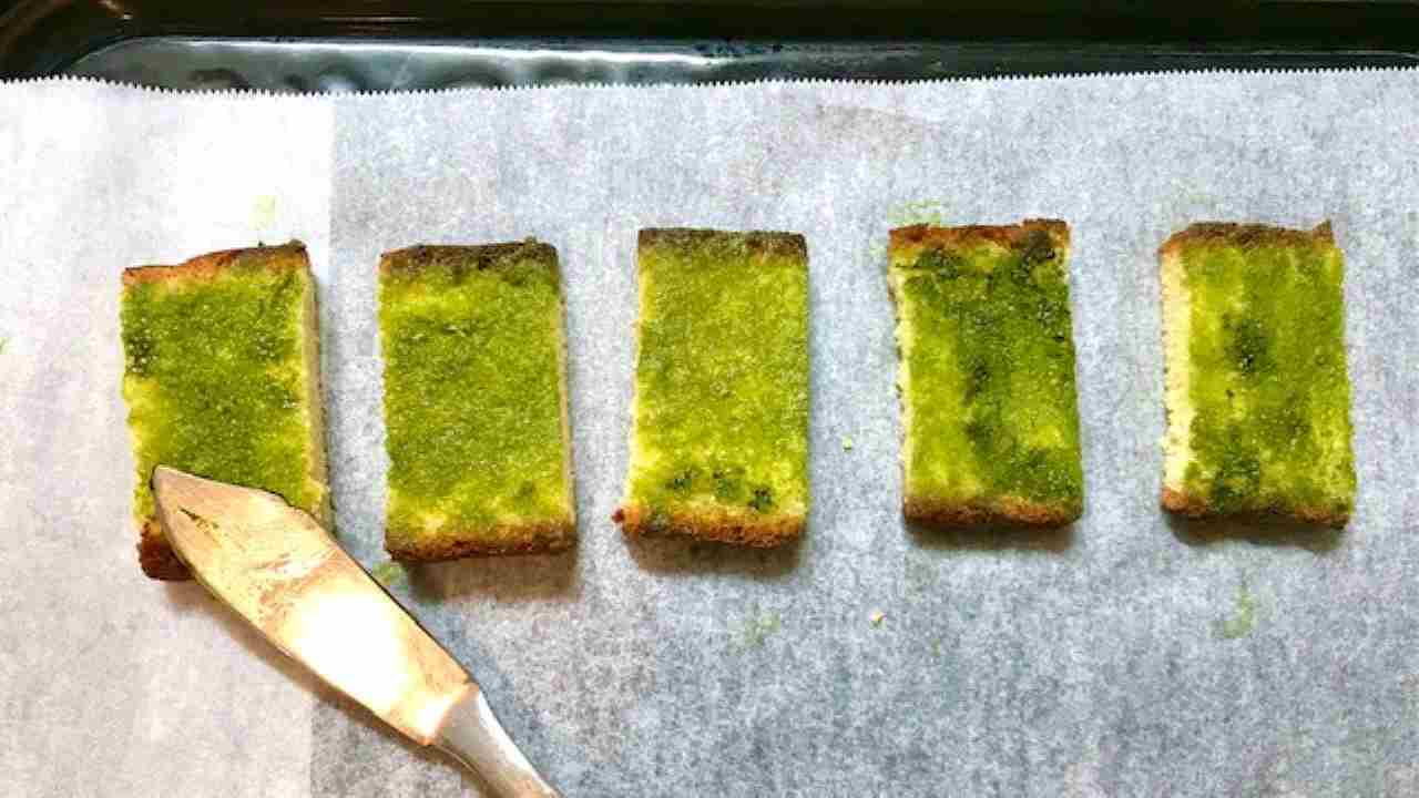 半分のカステラに1の抹茶バターをバターナイフ、またはハケで塗ります。