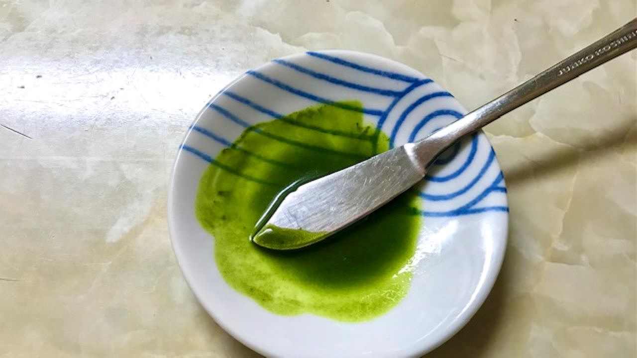 湯せんで溶かしたバターに純抹茶を少しずつ加え、均一になるまで混ぜ合わせます。