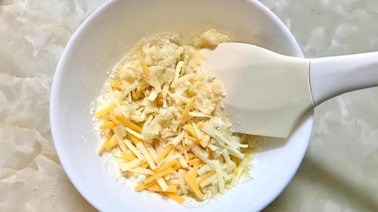 半分程度混ざったら(粉気が残っている状態)、シュレッドチーズを加えます。この時、チーズを切り刻むように混ぜ合わせます。
