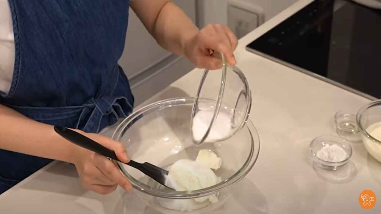 ボウルにクリームチーズとグラニュー糖を入れて、クリームチーズをボウルの縁に押してつぶすように混ぜる。なめらかなペースト状になるようにする。