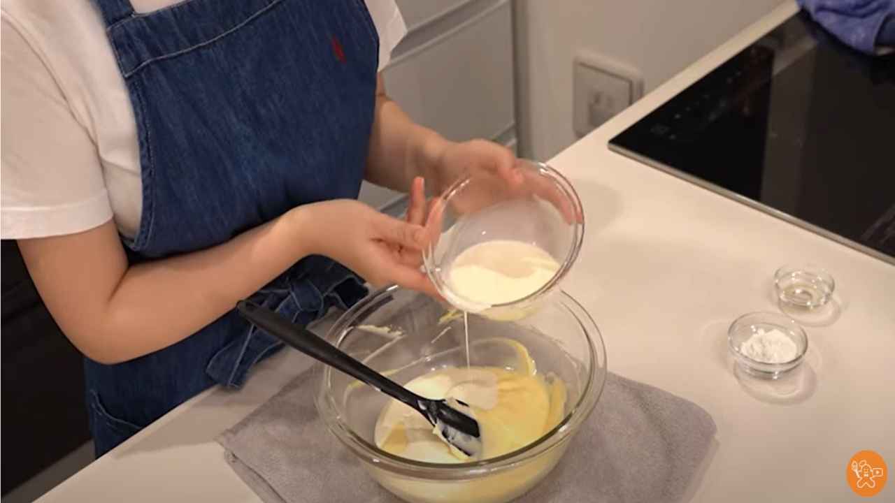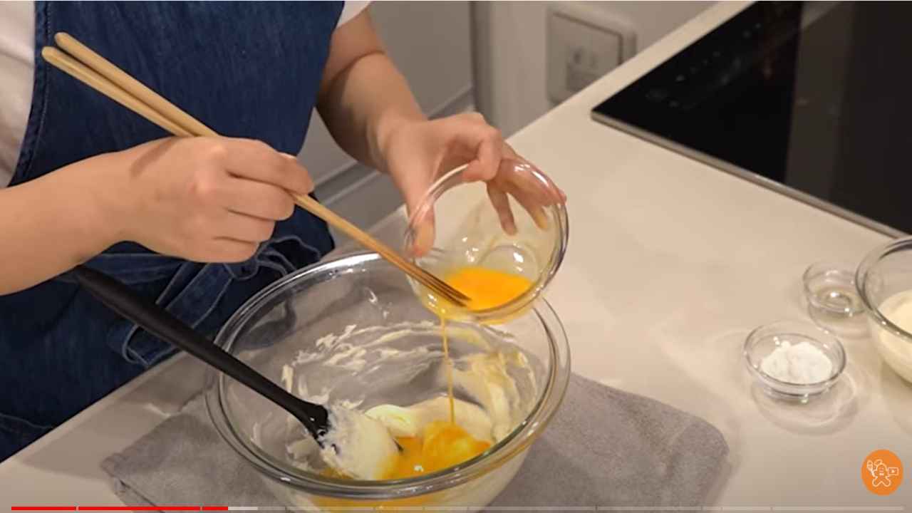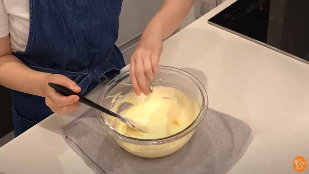 溶き卵を加え、なめらかなクリーム状になるまで混ぜる。卵が冷たいまままぜるとクリームチーズがダマになりやすいため、常温に戻したものを使用するようにする。