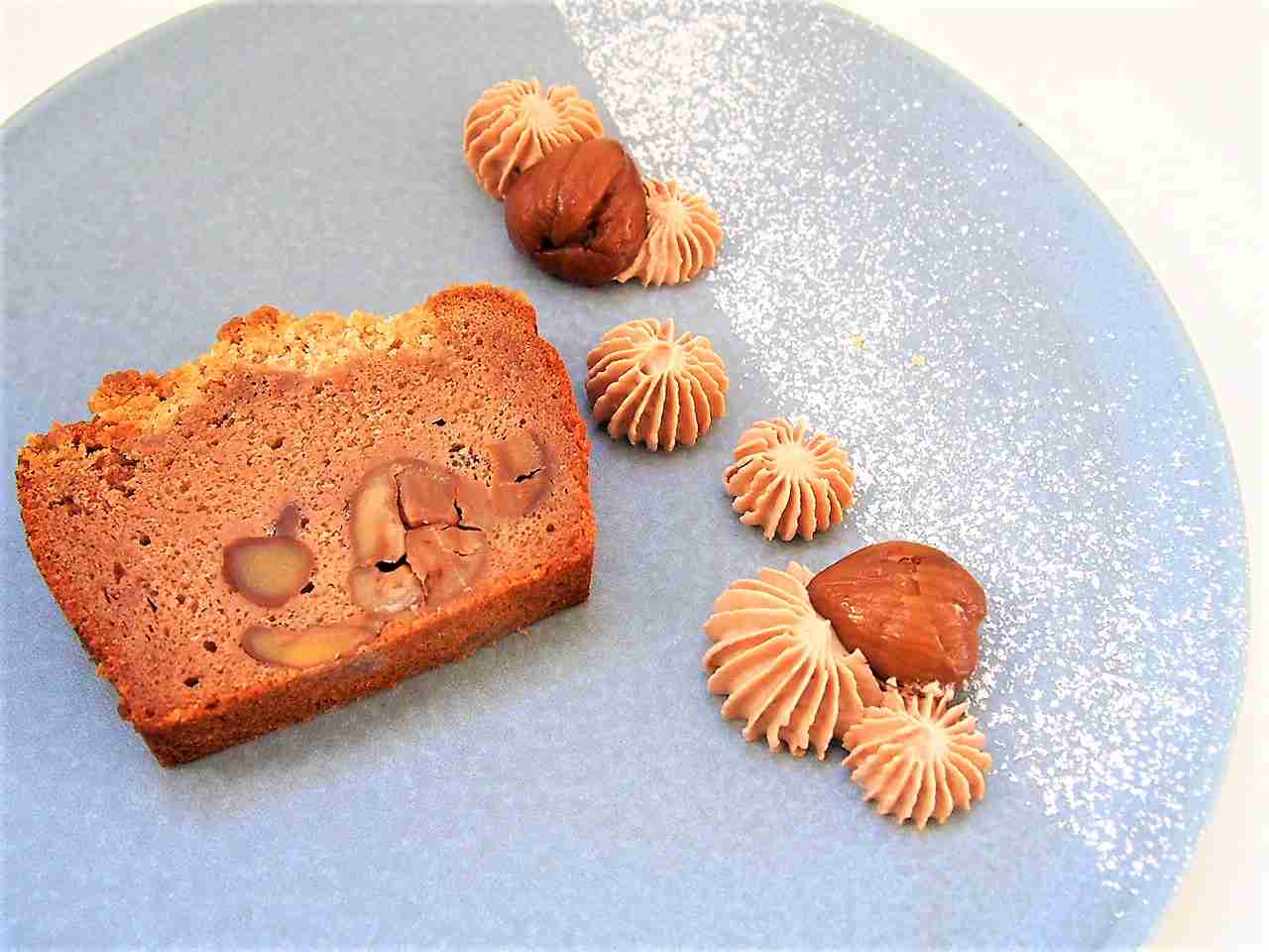 粉を使わずに栗の粉とマロンクリームを使い、栗の香りたっぷりのパウンドケーキです。和栗とは違う風味たっぷりの生地に栗の粉でできたクランブルを添えて食感も楽しめます。