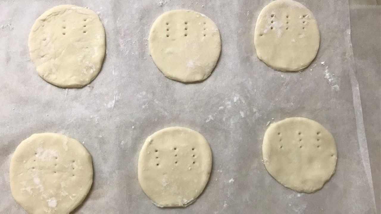 型抜きをして、半円のみフォークで穴を開けます。※型抜きの際、パイがくっつくようであれば、型に粉をつけてください。