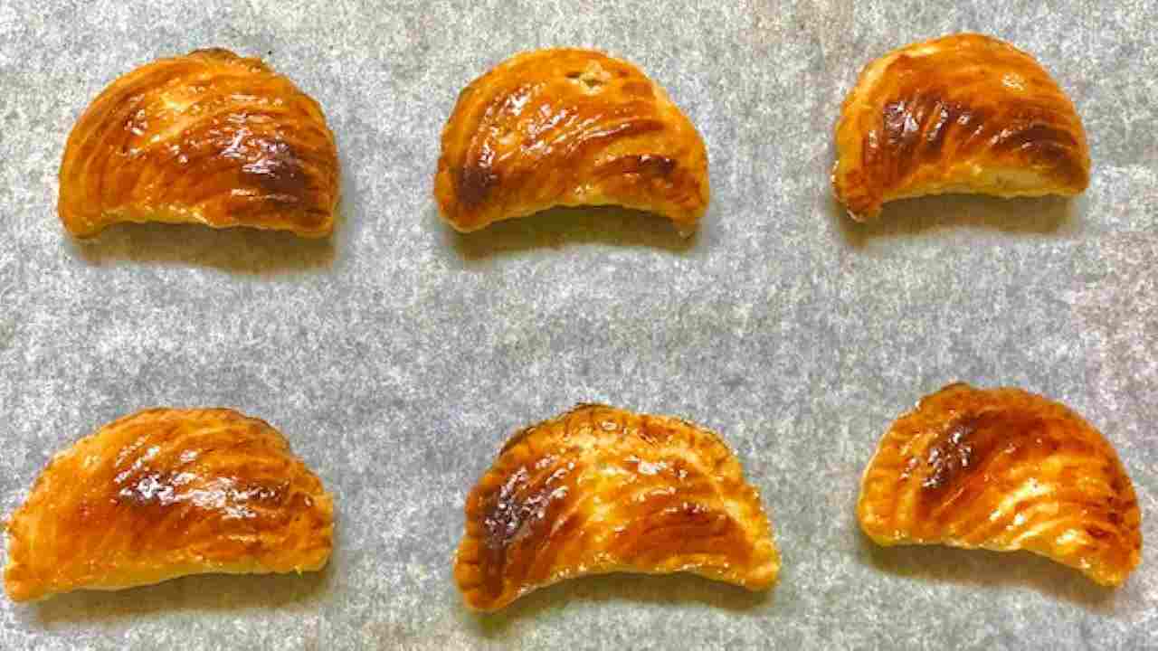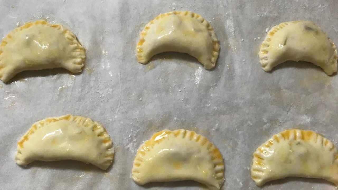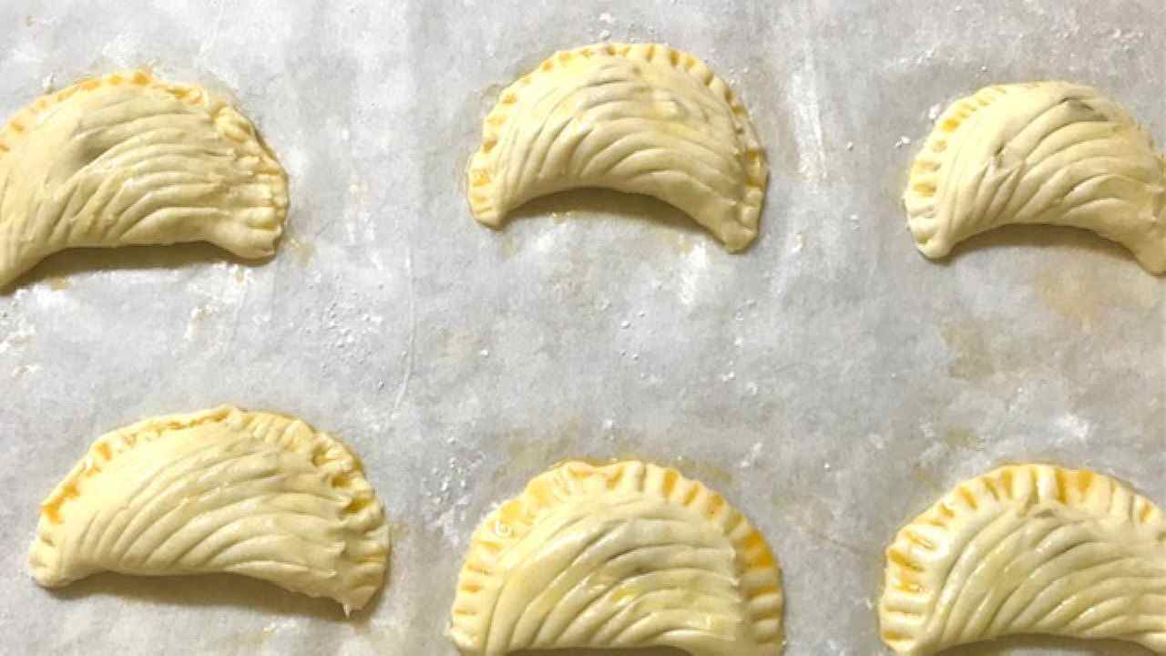 半分に折り、フォークの背で縁を押さえてしっかり閉じます。ハケで表面に溶き卵をぬり、冷蔵庫で15分程休ませます。