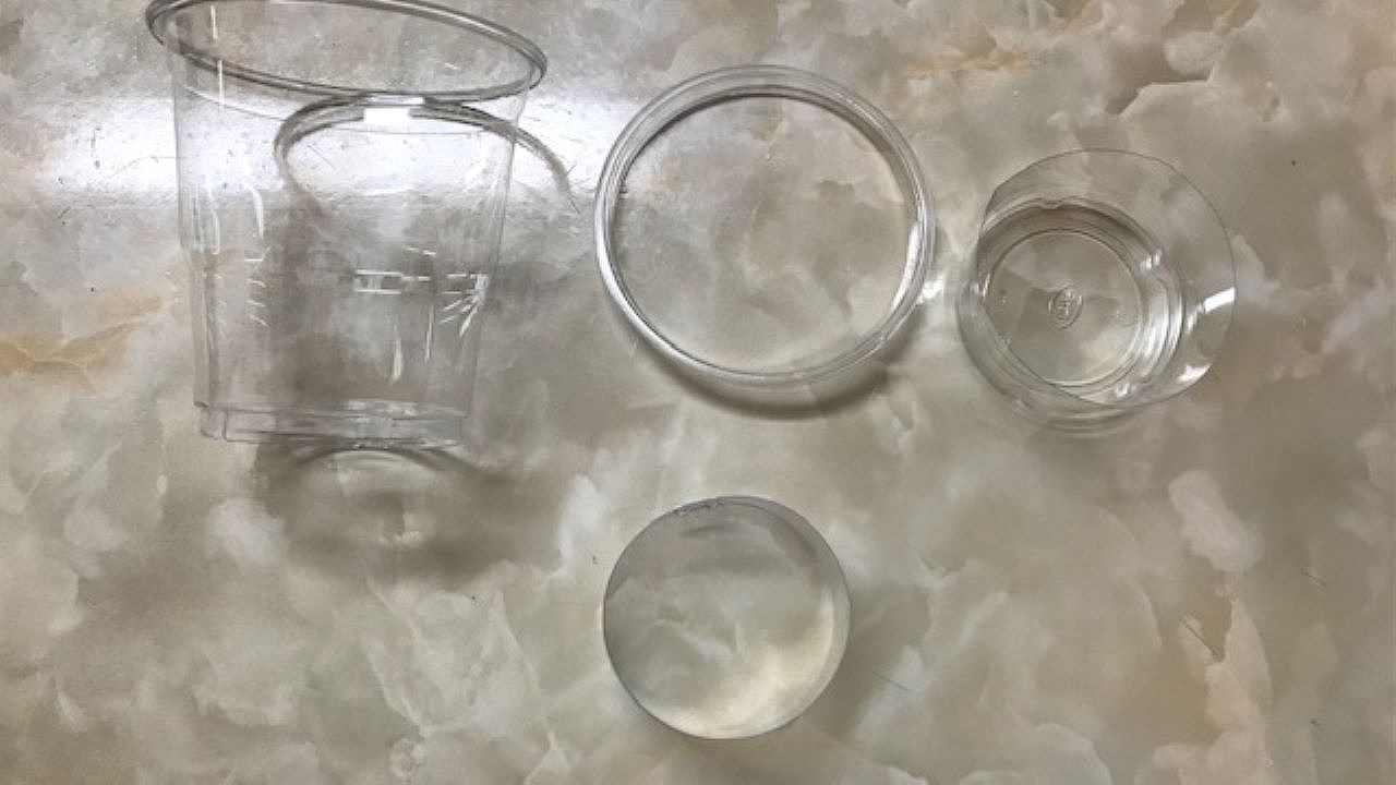 プラスチックコップをキッチンバサミでカットし、画像のように輪っかを作り、ホチキスまたはテープで止めたら完成です。