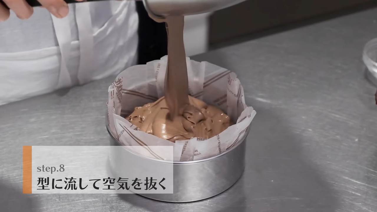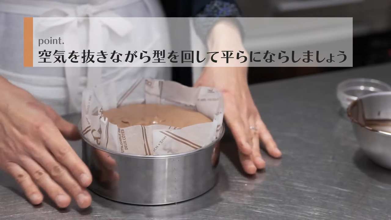 数回台に落として空気を抜き、型を回して平らにならす。