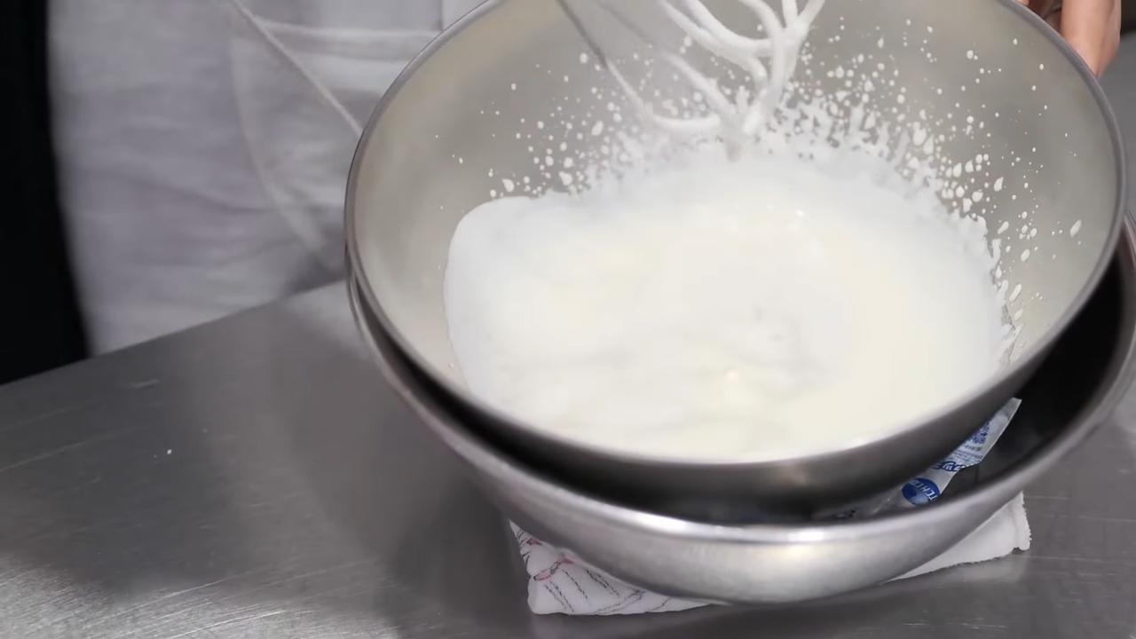 生クリームを氷水に当てながら7分立てに泡立てる。