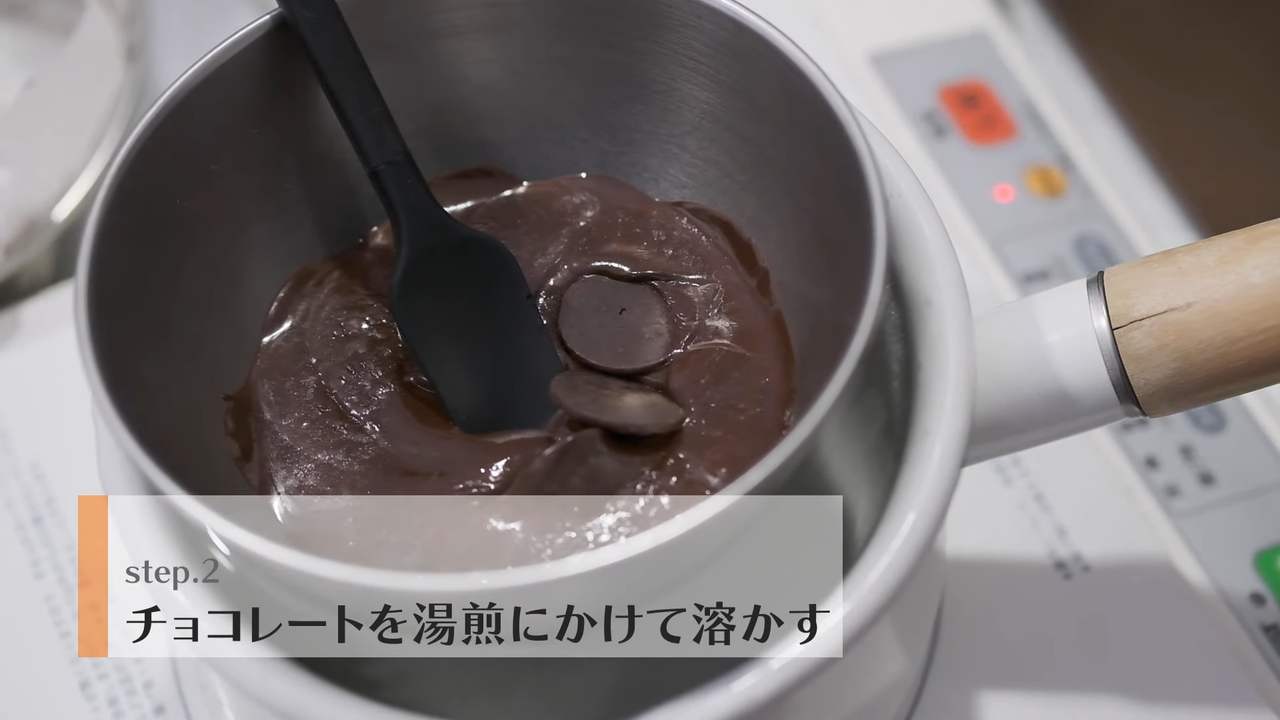 チョコレートを湯煎にかけて溶かす。