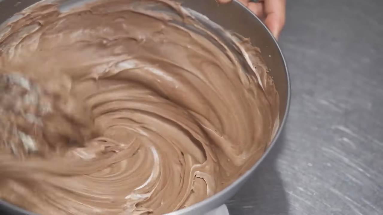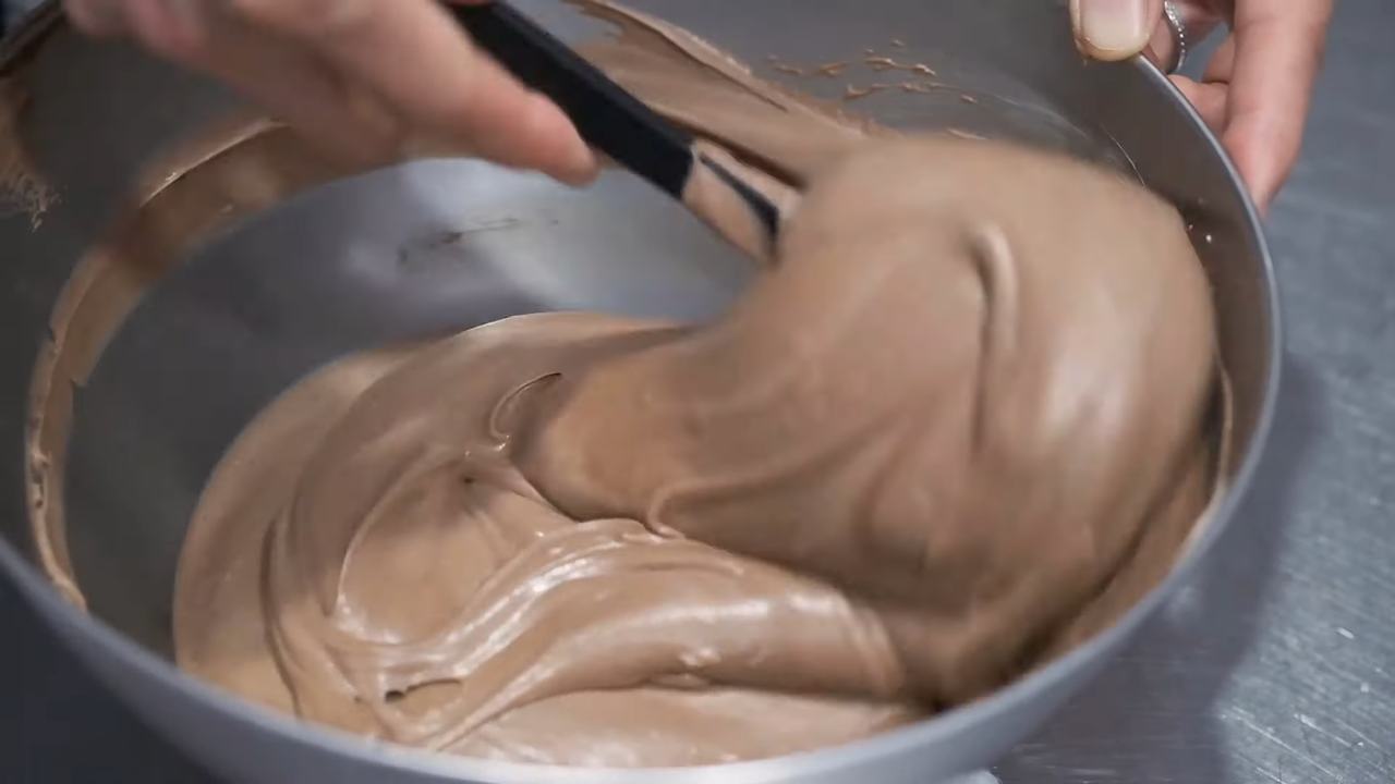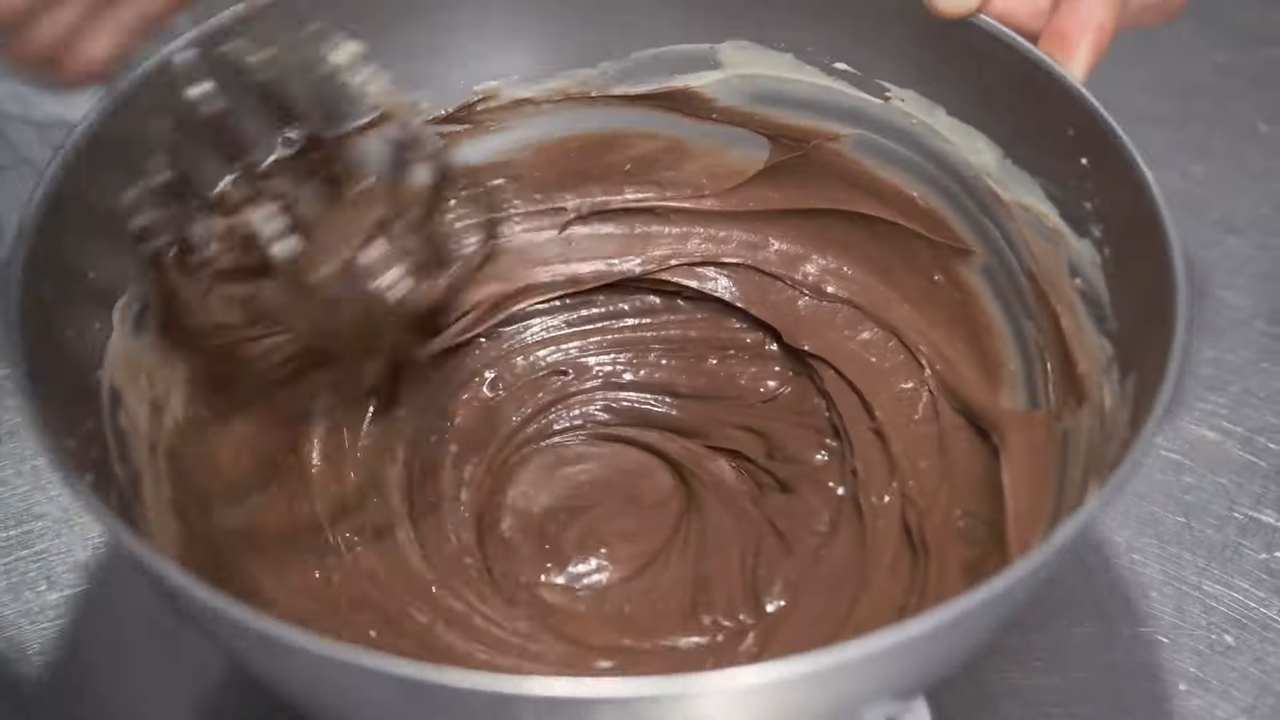 チョコレートを45℃に調整して加え、素早く混ぜる。