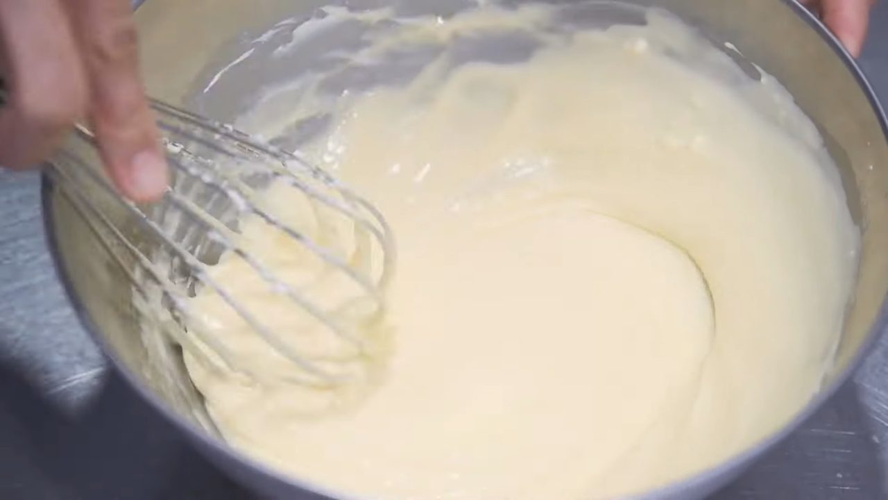 混ぜ合わせた卵を2回に分けて加え、その都度よく混ぜる。