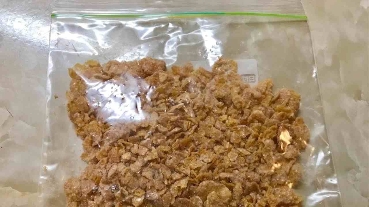 丈夫なポリ袋にコーンフレークを入れて麺棒を転がして細かく砕きます。