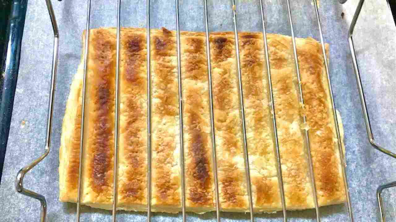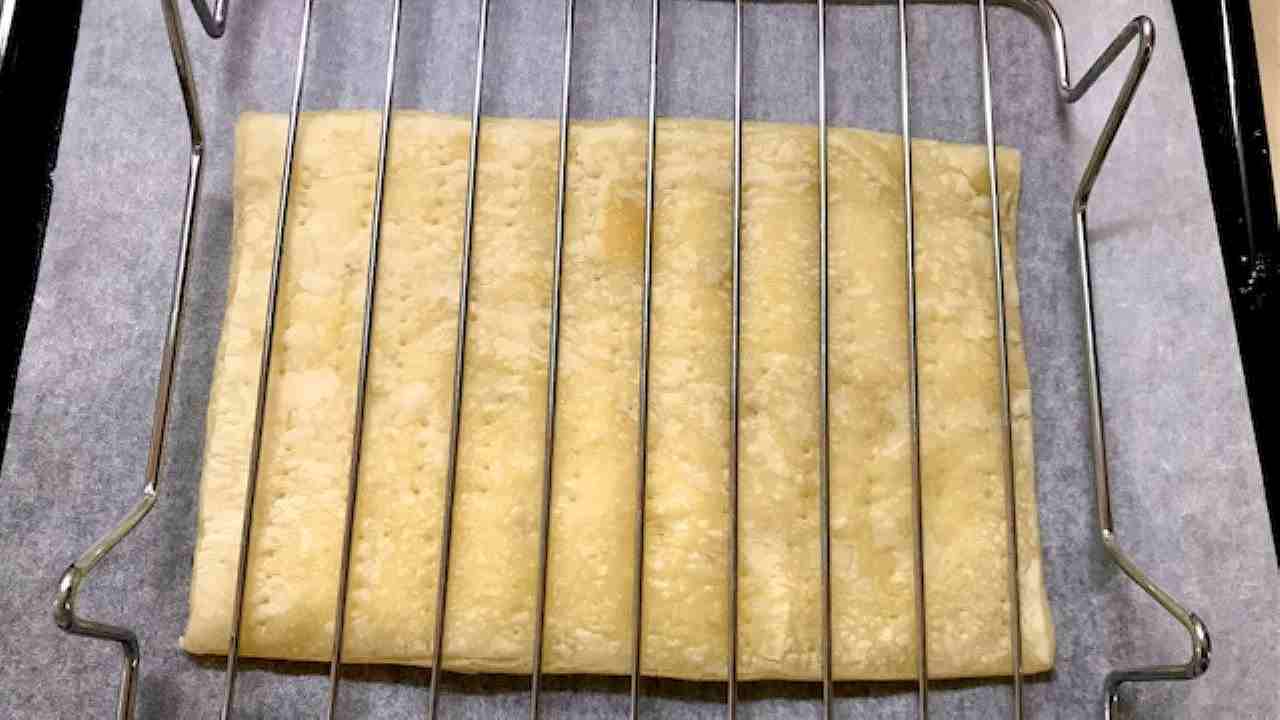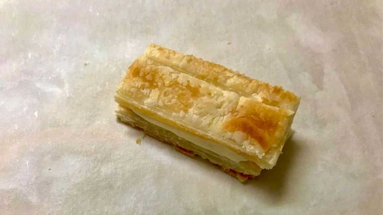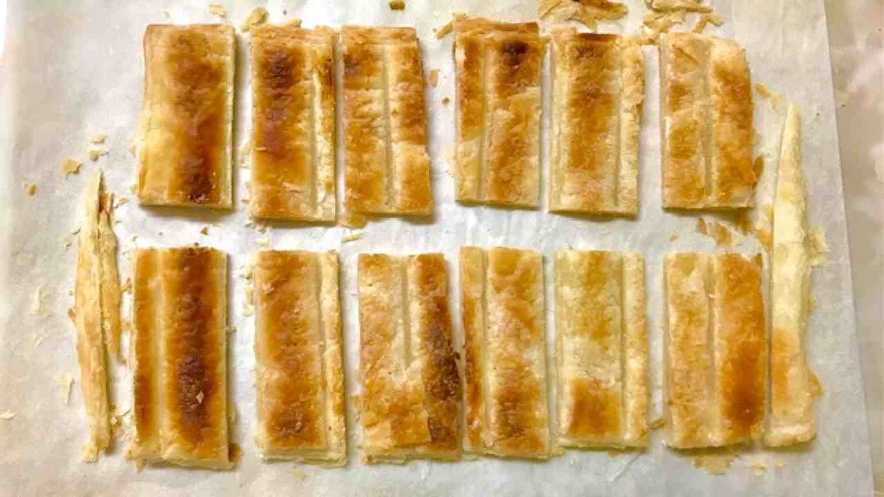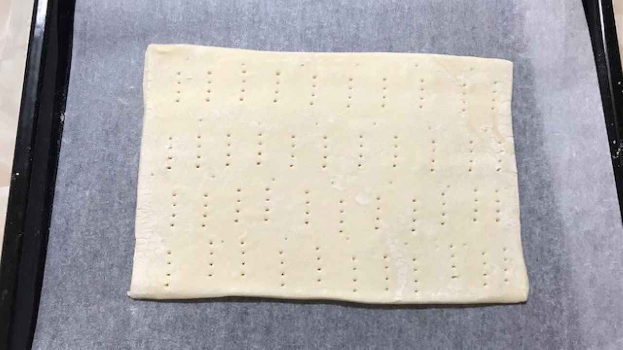 パイ生地が冷めたら、端は形を整えるために切り落とし、縦6等分、横は2等分に切ります。合計12枚できます。