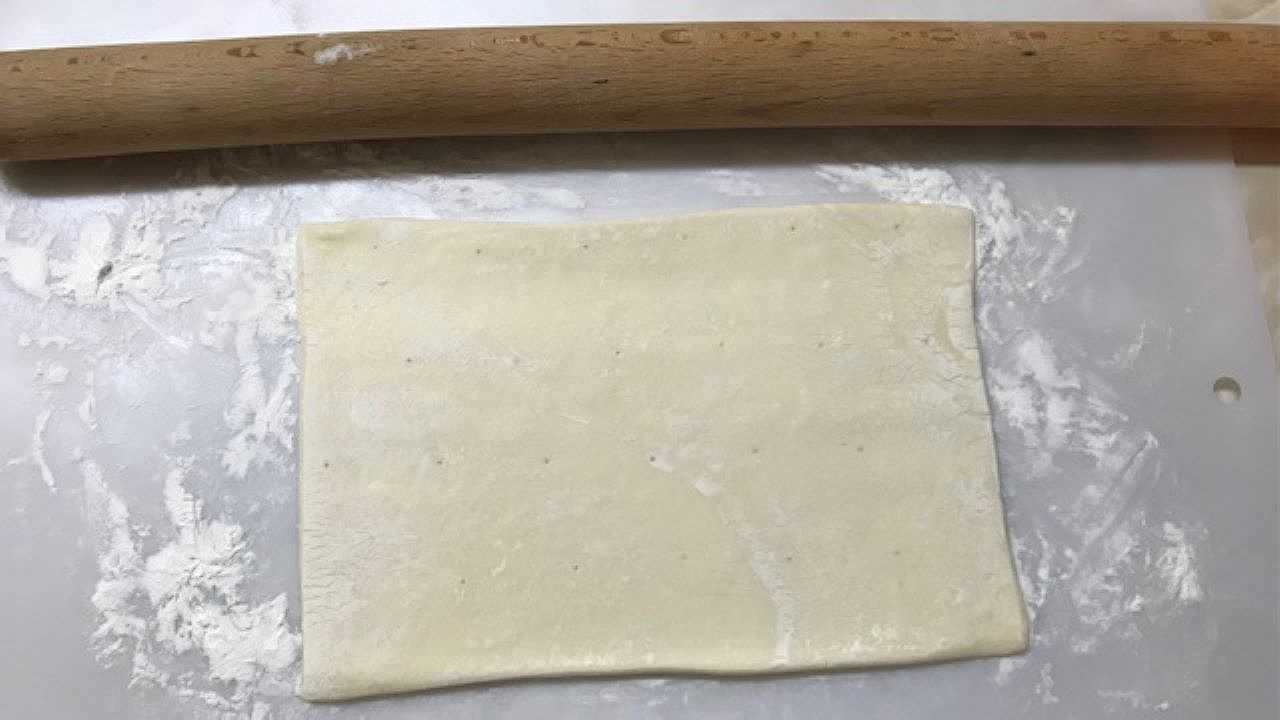 パイシートは、打ち粉をした台にのせ、麺棒で2~3mmの厚さに伸ばします(ここでは約21×15cm)。冷蔵庫で30分程度休ませます。