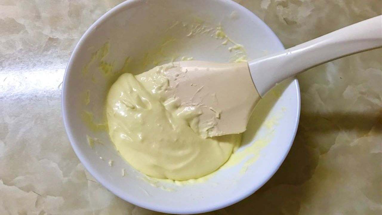 焼いている間にクリームを作ります。ボウルにクリームチーズを入れ、泡だて器で練り混ぜ、なめらかになったら練乳を加え更に良く混ぜ合わせます。