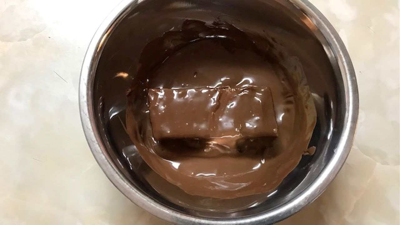 溶かしたチョコレートに8をくぐらせます。パイ全体をチョコレートでうすくコーティングしてください。