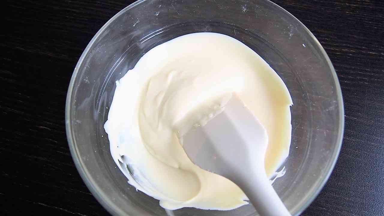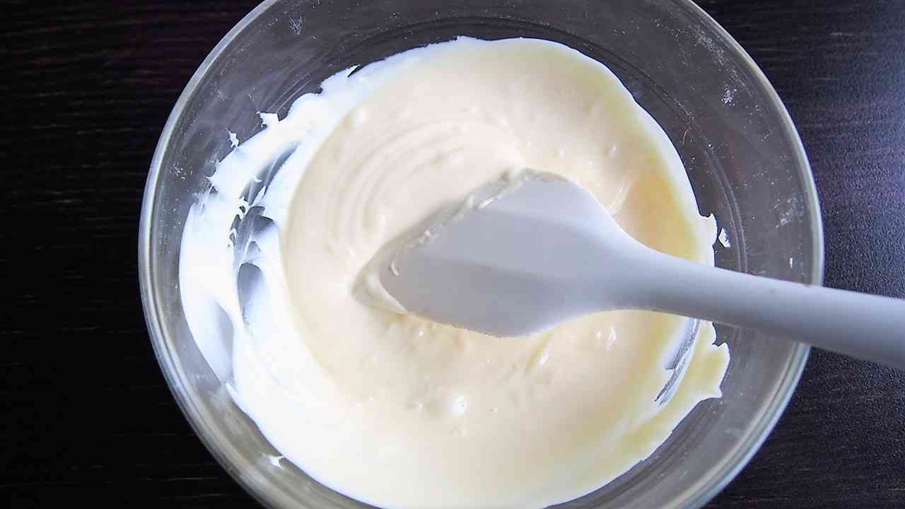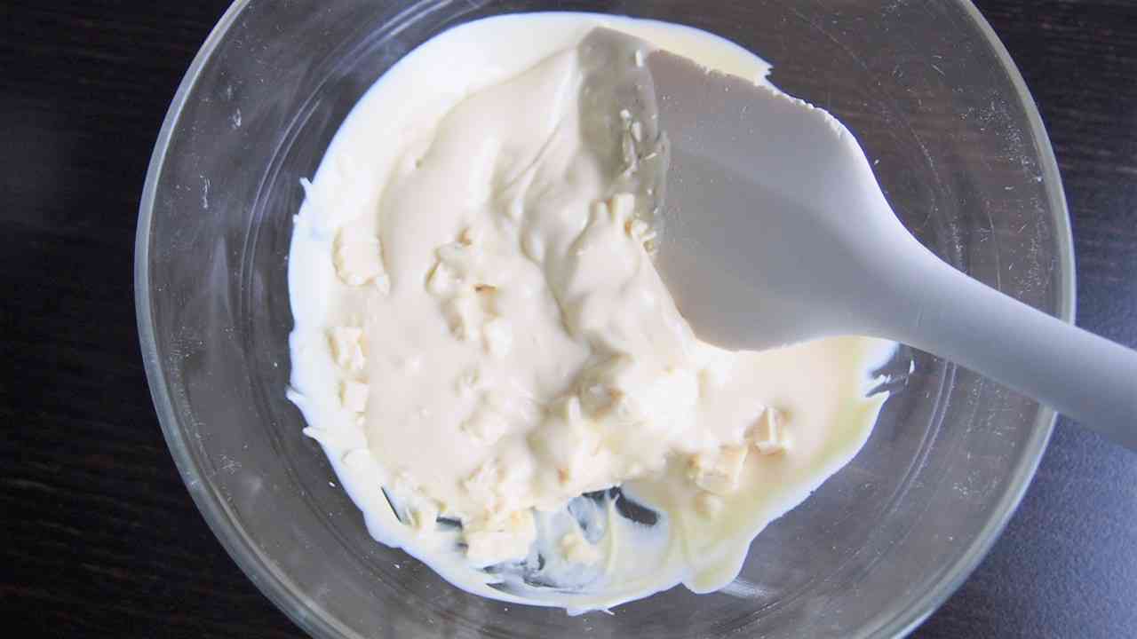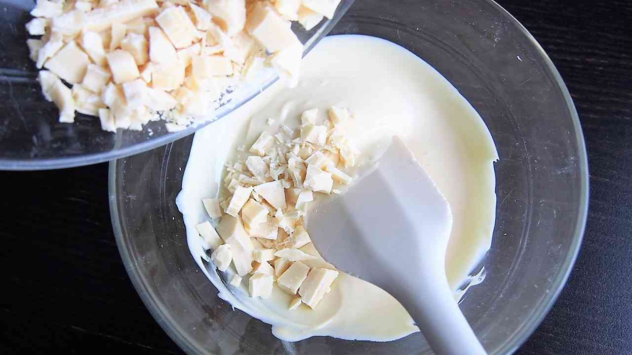 150gのホワイトチョコレートを電子レンジの300wで30秒ごとに取り出して混ぜながらゆっくりと焦がさないように溶かす。
