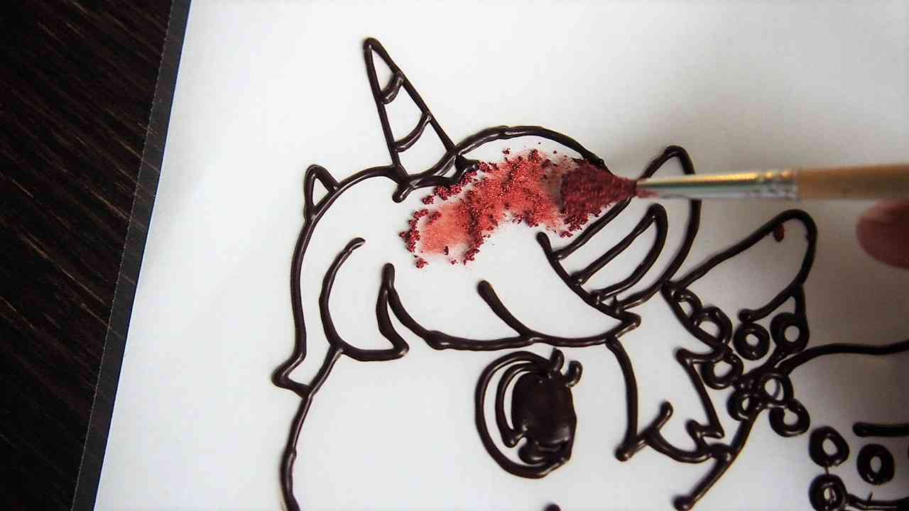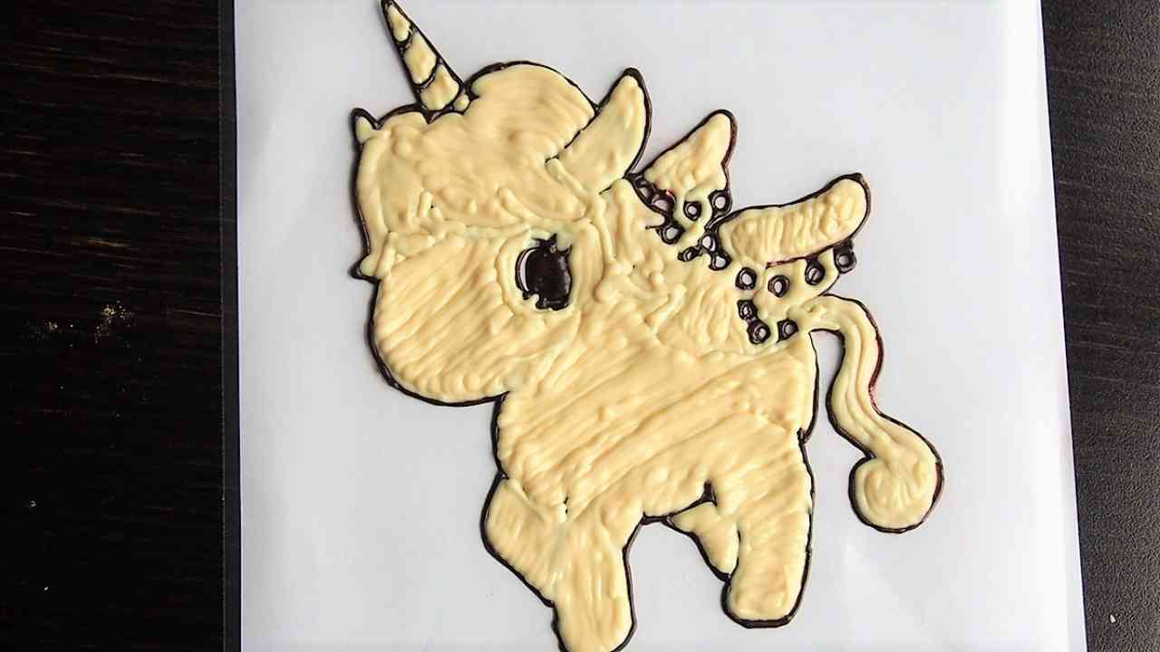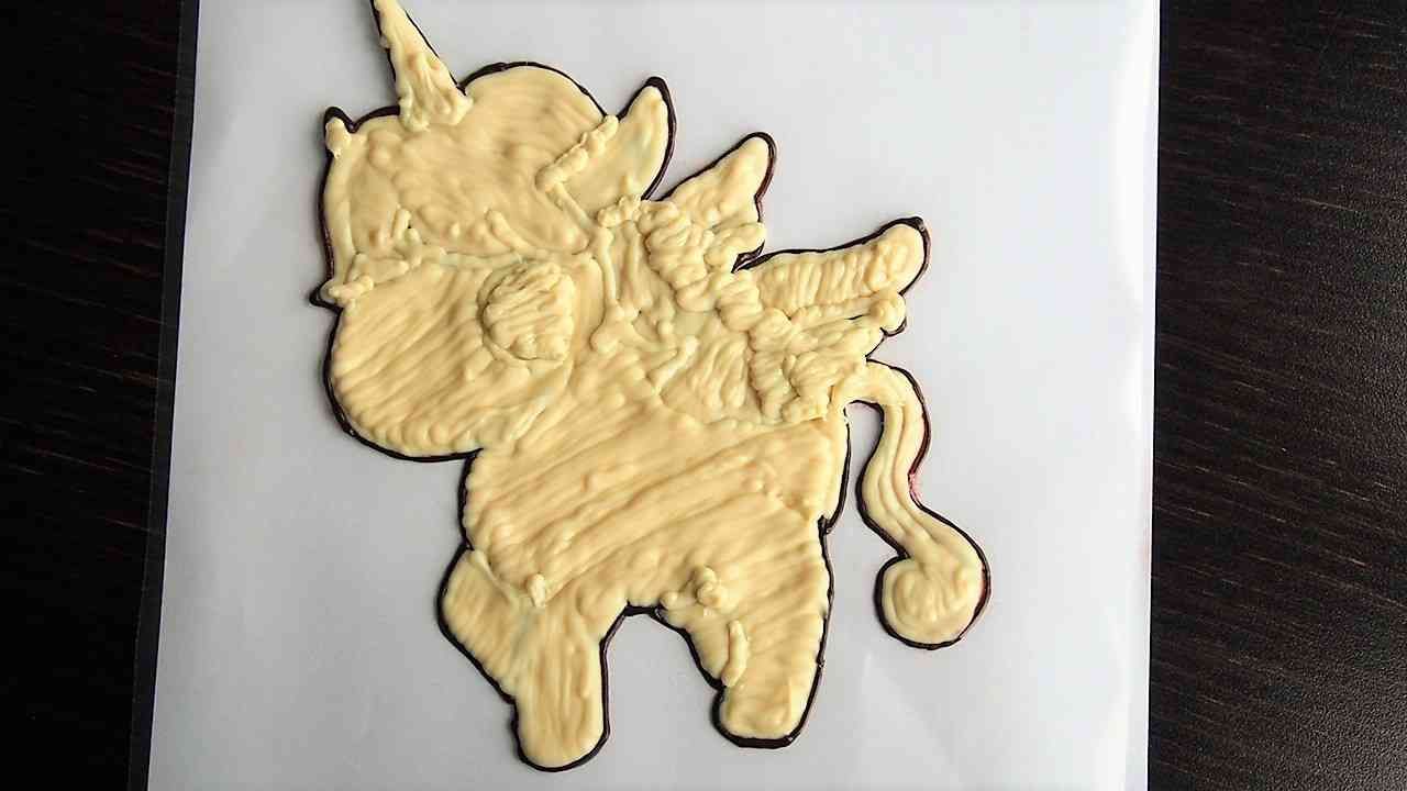 テンパリングしたホワイトチョコレートでブラックチョコレートで描いた線の中をコルネを使って塗っていく。