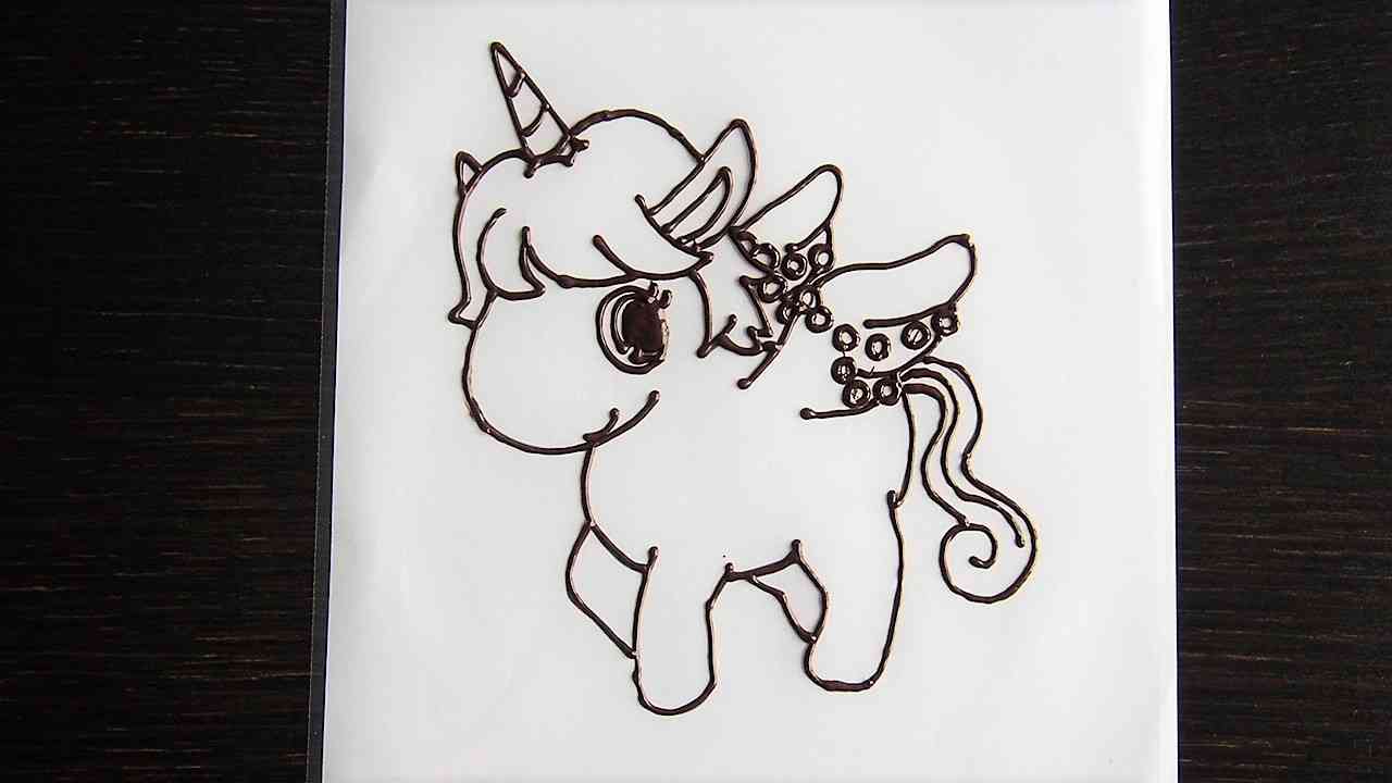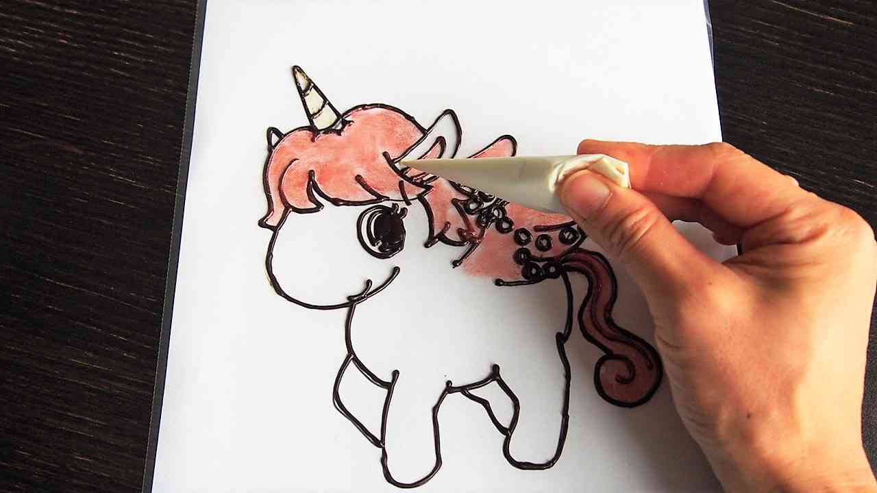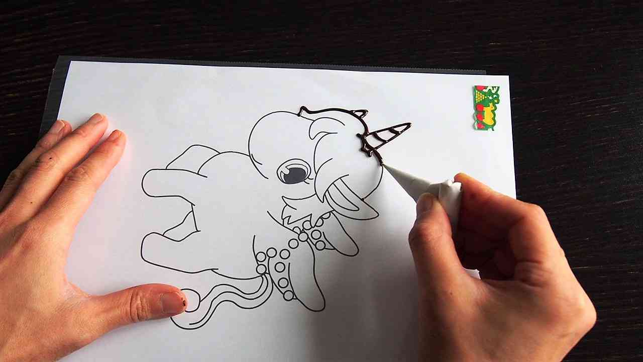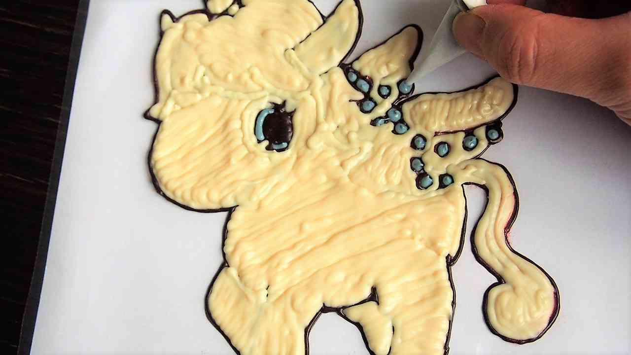 チョコペンで黒い線に沿って描いていく。