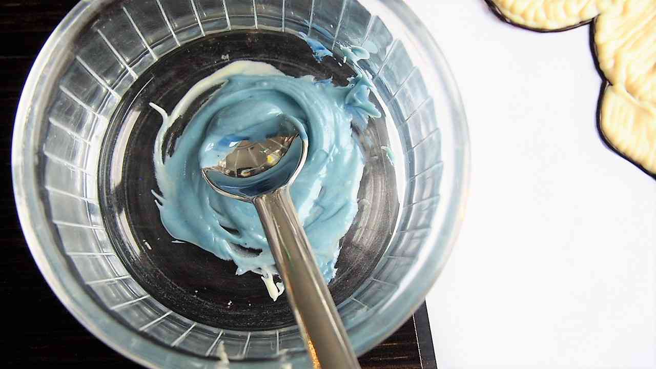 青色のチョコレートを作る。チョコレート用の色粉がある場合はホワイトチョコレートに混ぜて色を作ってもよい。