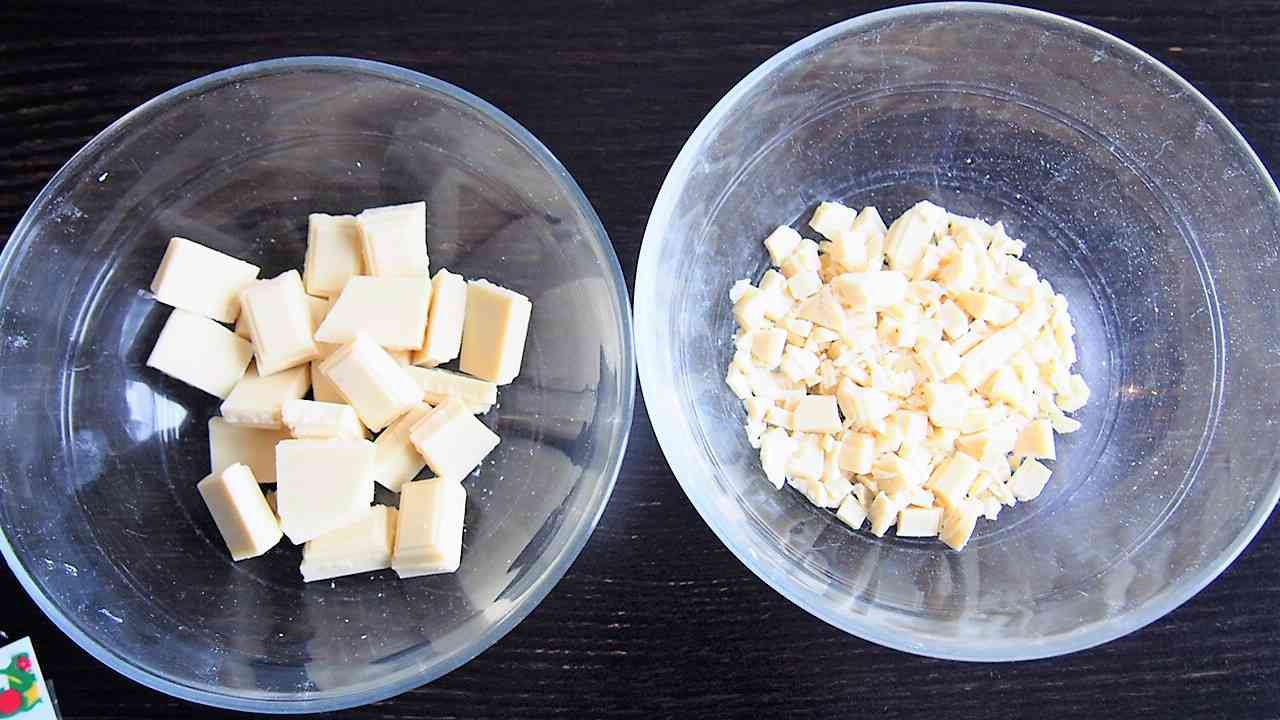 200gのホワイトチョコレートを150gと50gに分ける。50gの方は細かく刻んでおく。