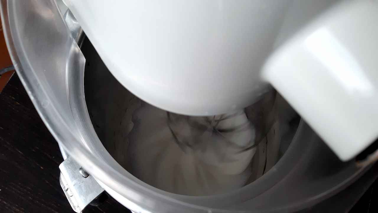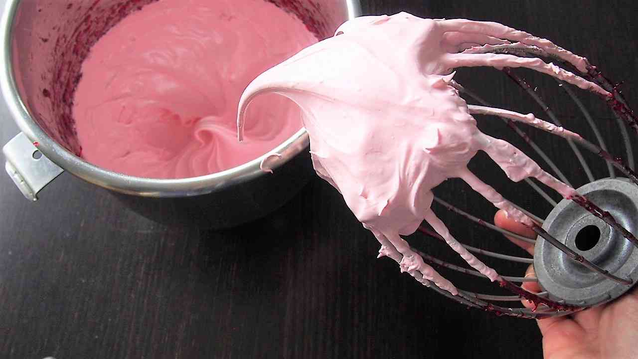 卓上ミキサーで攪拌している卵白の中にシロップを加えていく。