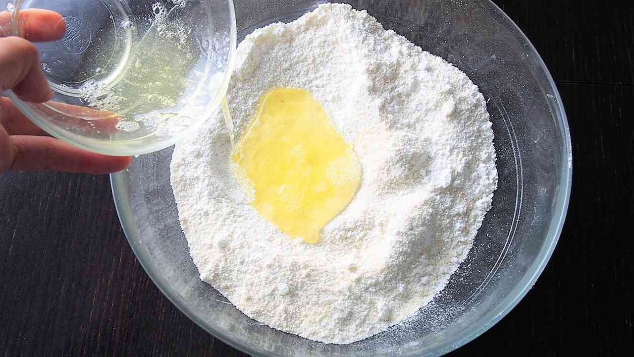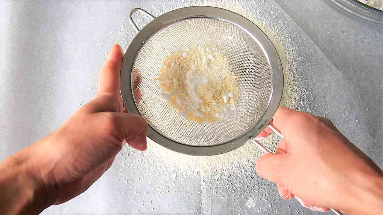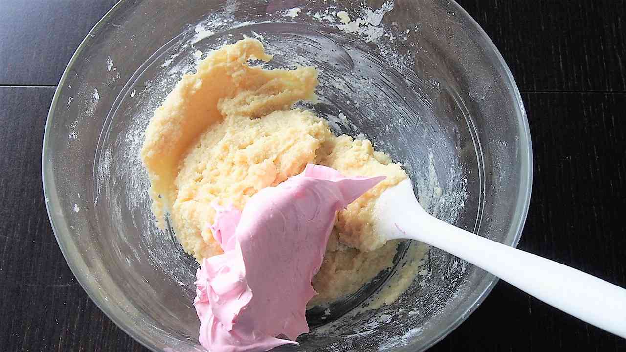 ふるった粉糖とアーモンドプードルの中に泡立てていないほうの卵白を加える。