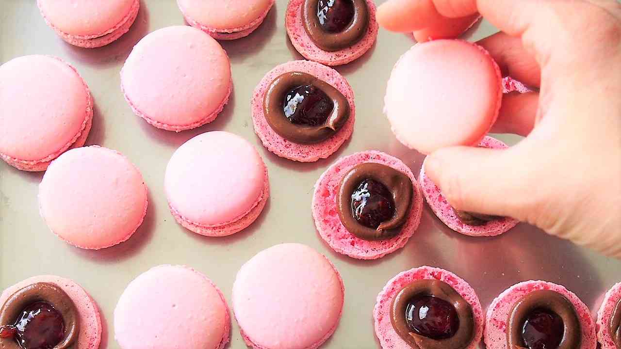 今回はイタリアンメレンゲを使った製法で、中はしっとり、外は軽く食感を残す製法で、ひとつのマカロンの中に二つの味を隠してみました。