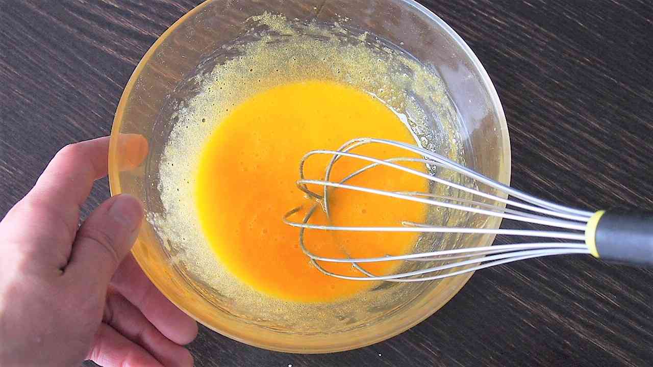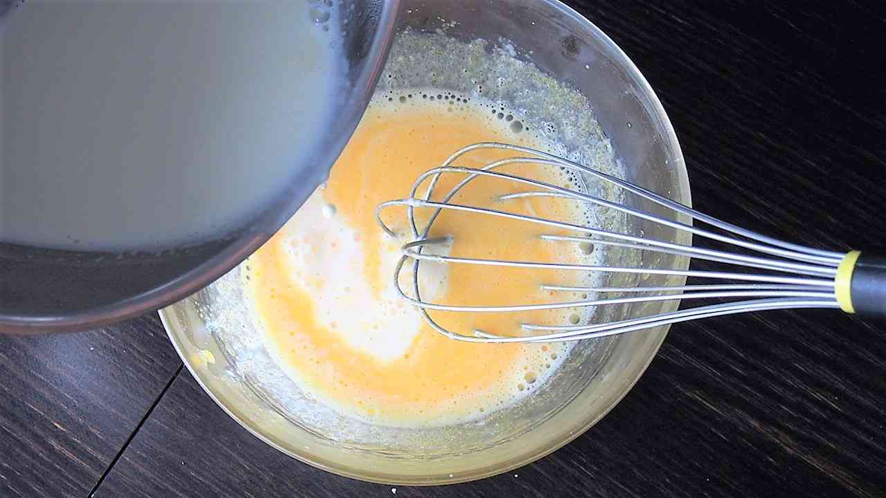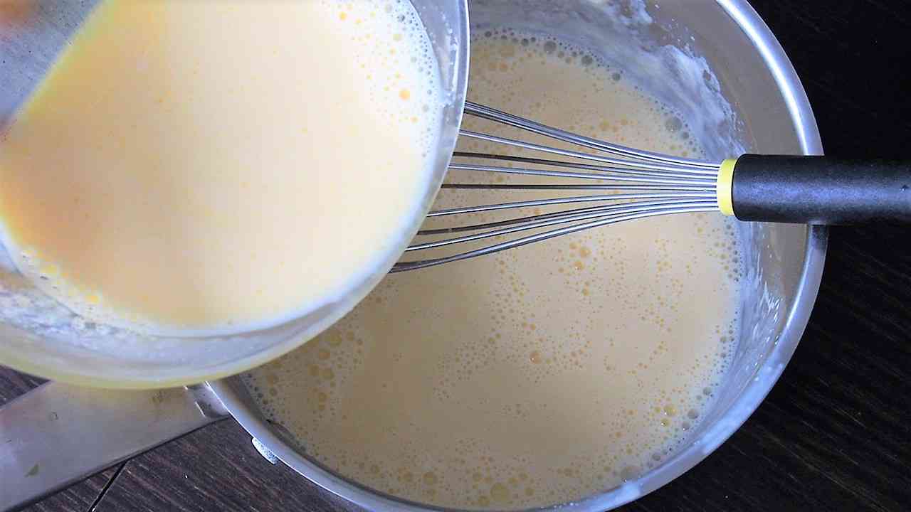 卵黄とグラニュー糖を合わせてよく混ぜ、②を混ぜながら注いでいく。